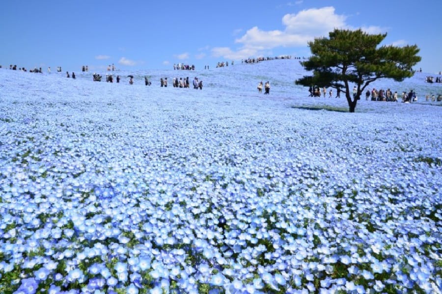 在日本的春季,除了賞櫻之外,位於日本茨城的日立海濱公園藏有一幅令人驚艷的美景。每年4月下至5月上旬,大地上開滿了約450萬朵的粉蝶花,宛若成千成萬隻美麗的蝴蝶繽紛地飛舞,大地與藍天將染上一片優雅的紫羅蘭色彩,4月下旬還有250萬株鬱金香爭相競艷、增添光彩。