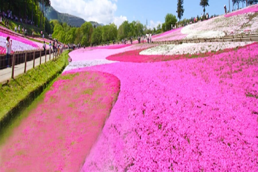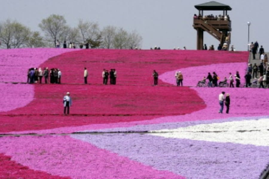 這裡的芝櫻之丘號稱是日本最大,公園以中央的小谷分為南北兩邊,南邊有著名的「芝櫻之丘」,每當4月上旬至5月上旬,芝櫻花田開滿整片山坡,猶如鋪上粉紅色的花毯,美不勝收。