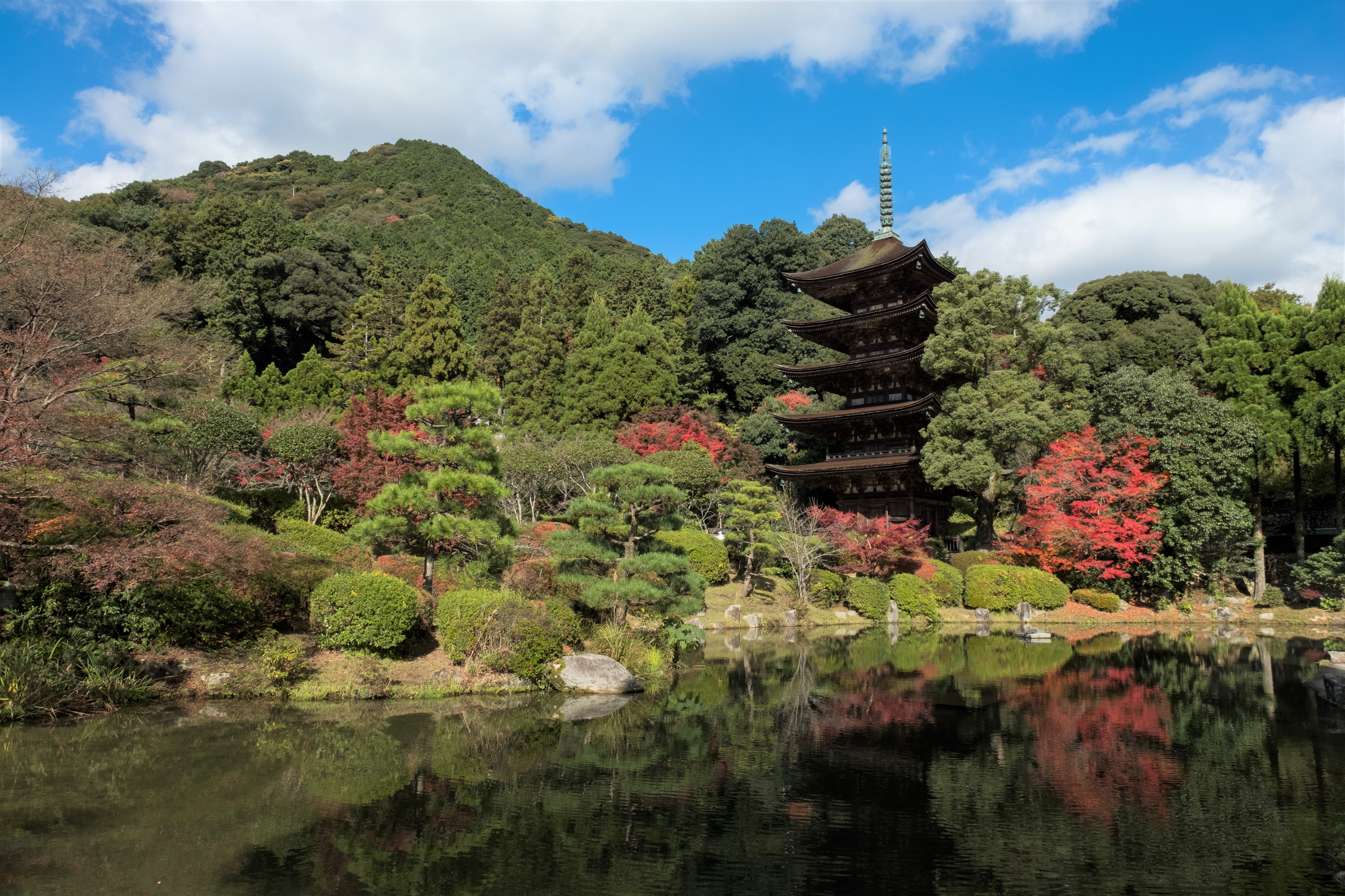 有著「日本3大名塔」美名的瑠璃光寺五重塔,是除了京都與奈良以外,西部保存完好的古老木造塔樓,也是14世紀時大內氏效仿的京都文化中最具代表性的建築。猶如琉璃光寺的名稱般,遠觀就能為那內斂雅緻線條散發出的自然光暈吸引,靠著群山與水池相映的幽靜美景,如山水繪卷般,依著四季染上不同花姿色調,境內的香山公園秋冬以紅楓、梅花作伴,春季換上柔和清新的淡雅櫻花粉,夜晚點燈時,更吐露著寧靜優雅的美。走進一旁的琉璃光寺本堂,靜謐清幽的莊嚴氛圍為旅人帶來療癒寧靜的片刻。藥師如來佛參拜堂的大佛串珠穿越佛繩,小心翼翼將串珠緩緩落下,據說八聲脆響環繞佛堂之際,也將八個煩惱隨之帶走。