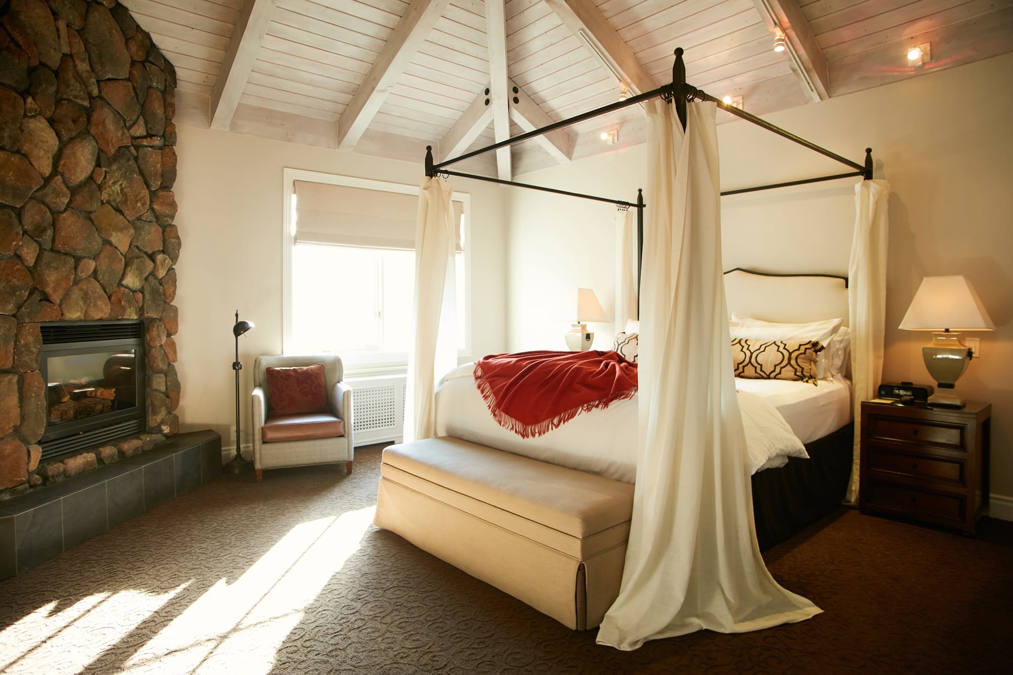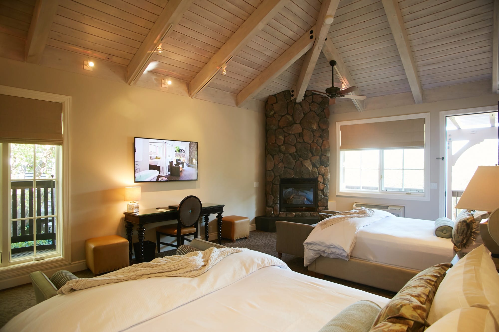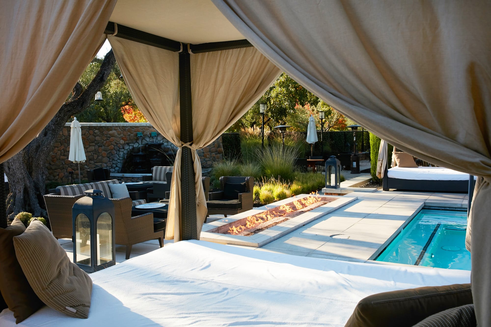Yountville Resort提供80間寬敞的套房,除了雙床房型,每一間都配置四柱特大床,讓旅人享受如國王般的豪華待遇。彷彿與世隔絕的小陽台,也是令人心神嚮往之所在,可以保有私人的隱蔽空間,卻又能擁抱自然的陽光與微風。此外,飯店還有設置SPA、按摩護膚及露天游泳池,面面俱到的設計及貼心服務,更獲得美國知名雜誌《Conde Nast Traveler》青睞,獲選為全球100家新興酒店與餐廳。