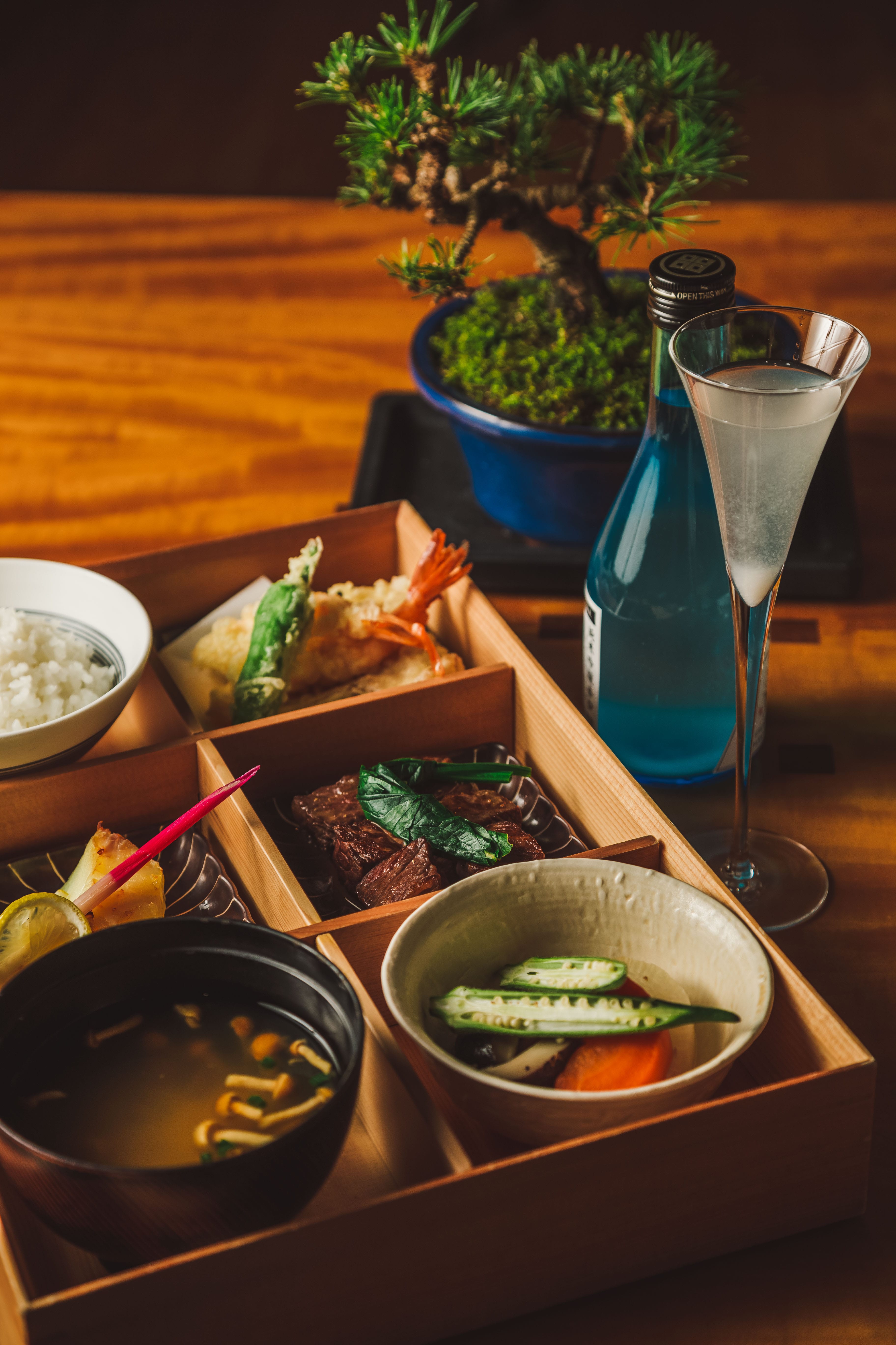 日本橋的奢華旅宿東京文華東方酒店推出專屬客房餐飲服務,其中日式便當融入縮景的概念,整齊的方格便當盒放入日本乃至於世界各地的名貴珍饈,可說是名符其實的味蕾旅遊。反映四季的當旬青蔬以鰹魚高湯燉煮,滋味純粹而雋永。天婦羅選擇漁港直送新鮮漁獲,以輕薄炸衣鎖住鮮甜。最高等級A5和牛做成入口即化的牛排,與京都代表料理西京燒相互呼應,日本大地的茂密綠意與豐饒的海洋生態在化口中為美妙嘆息。此刻佐餐的氣泡清酒起了絕佳的融合作用,整體風味在氣泡催化下顯得更鮮活。走過舌尖上的日本,優游於美食縮景園,一道便當六宮格,道盡了日本料理的豐富底蘊。