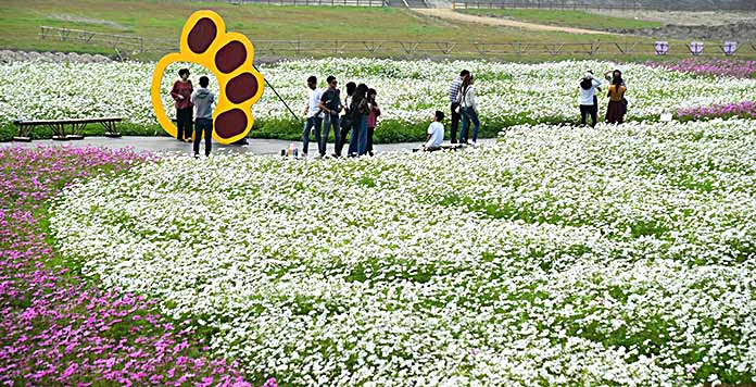 2018南投燈會持續吸引人潮,尤其在貓羅溪高灘地,縣府佈置面積逾2.5公頃花海,讓民眾白天穿梭在美麗的花海裡,拍攝五顏六色的波斯菊。