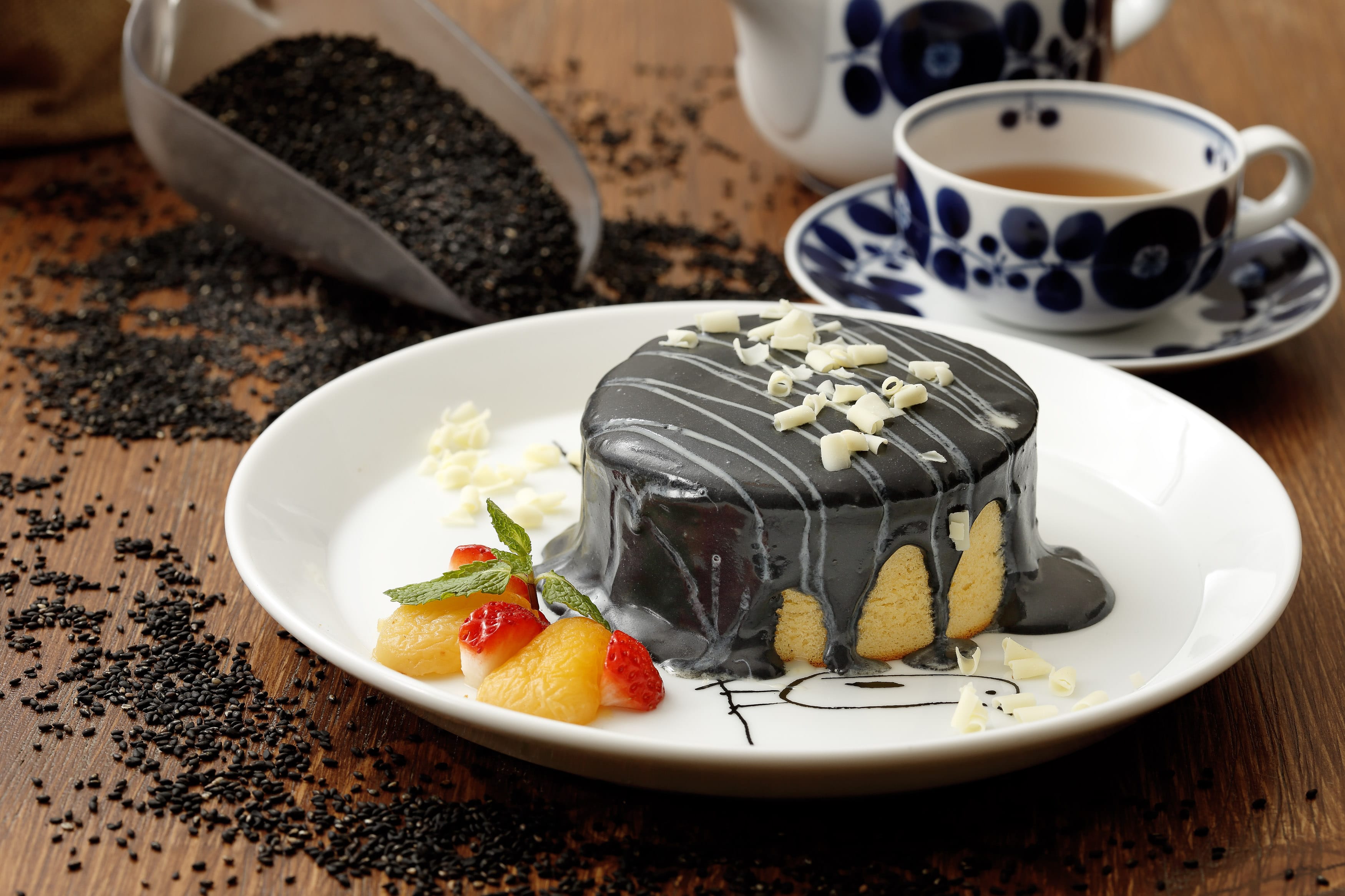 低調高雅的黑色外觀,由來自日本的胡麻醬與竹炭粉,以及鮮奶油、 煉乳慢火細燉而成,溫度控制得宜的熬煮, 使胡麻醬不至於油水分離,除保有濃郁香氣以及適度濃稠風格, 嚐起來更格外清爽,再搭配鬆軟厚鬆餅一同品嘗,清新的胡麻香氣, 讓人忍不住一口接著一口。此外,一旁也再點綴草莓、杏桃等水果, 增添亮彩視覺與清爽果酸。