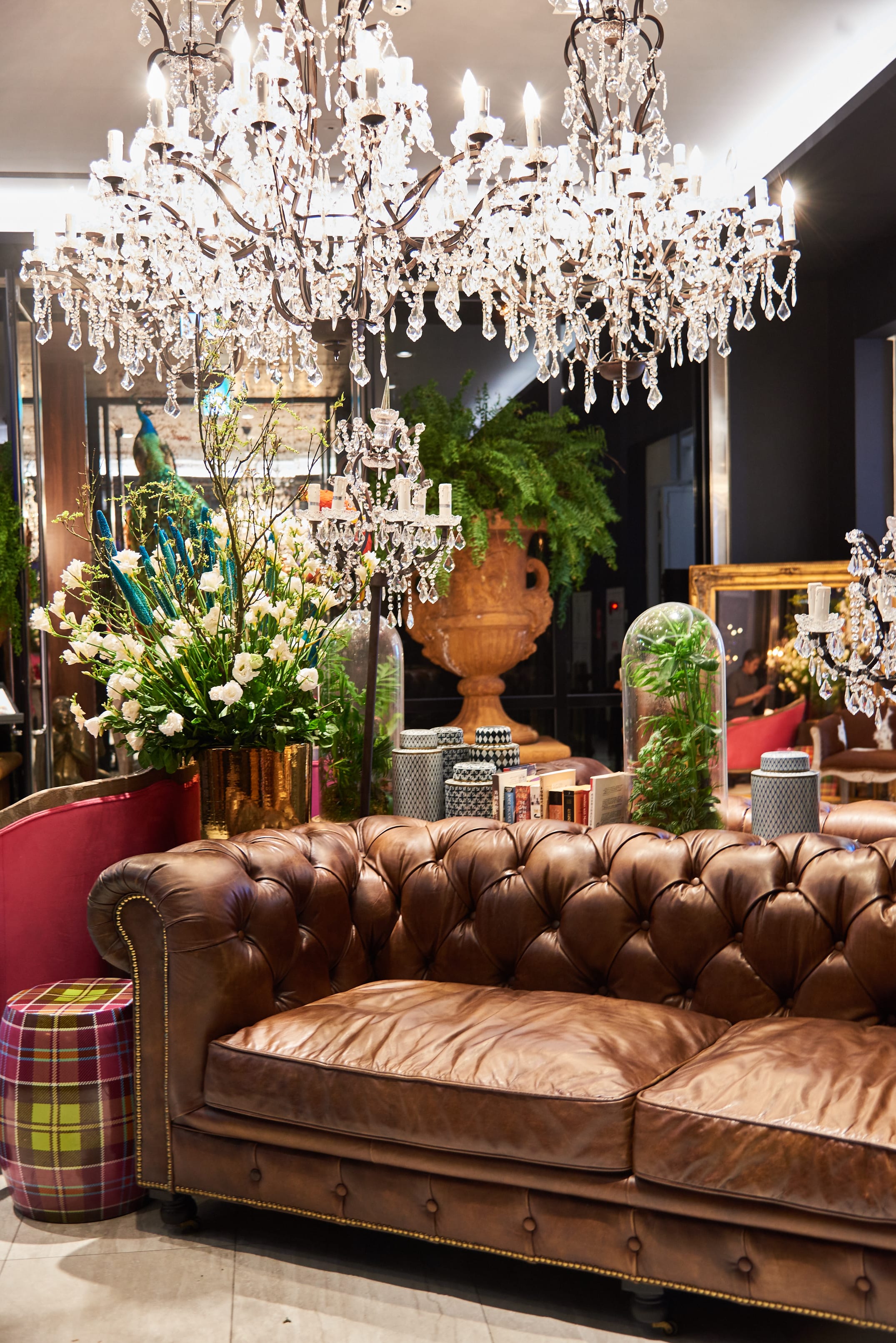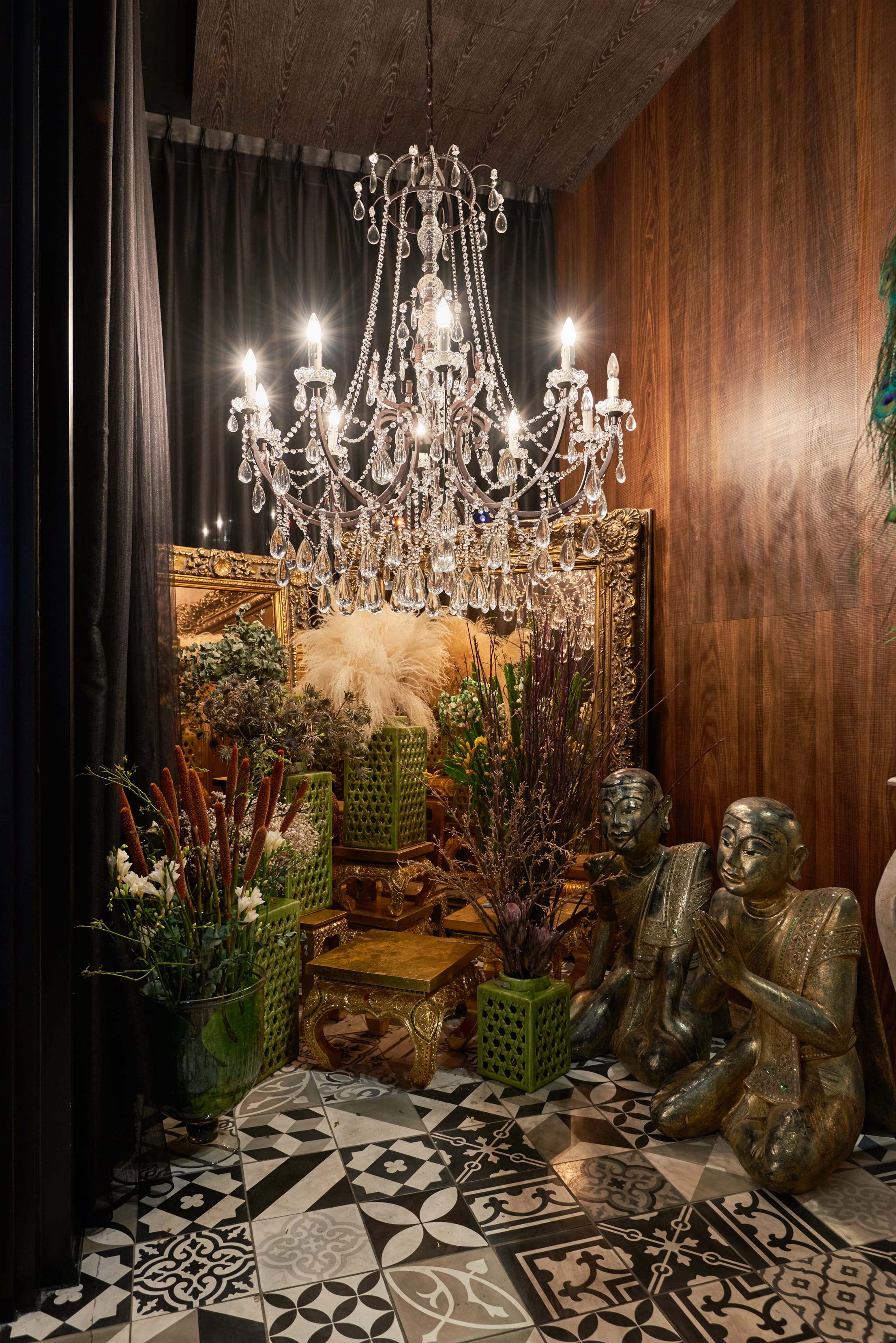 延續WOO清邁本店的泰式自然風格,台灣的每家餐廳外觀同樣被大 片泰式綠意所圍繞,還沒走進去就已經感染一身悠閒泰式風情。 沒意外的話,一般人在踏進餐廳lobby的第一步就會發出第一聲 ”WOO”。猶如藝廊的大廳入口,大孔雀、鴕鳥羽毛等大型動物裝 置藝術迎面歡迎,加上一盞盞從天空直落而下的奢華水晶吊燈及一幅 幅映入眼簾的藝術作品,在在讓人忘了身處的是一家泰式餐廳。