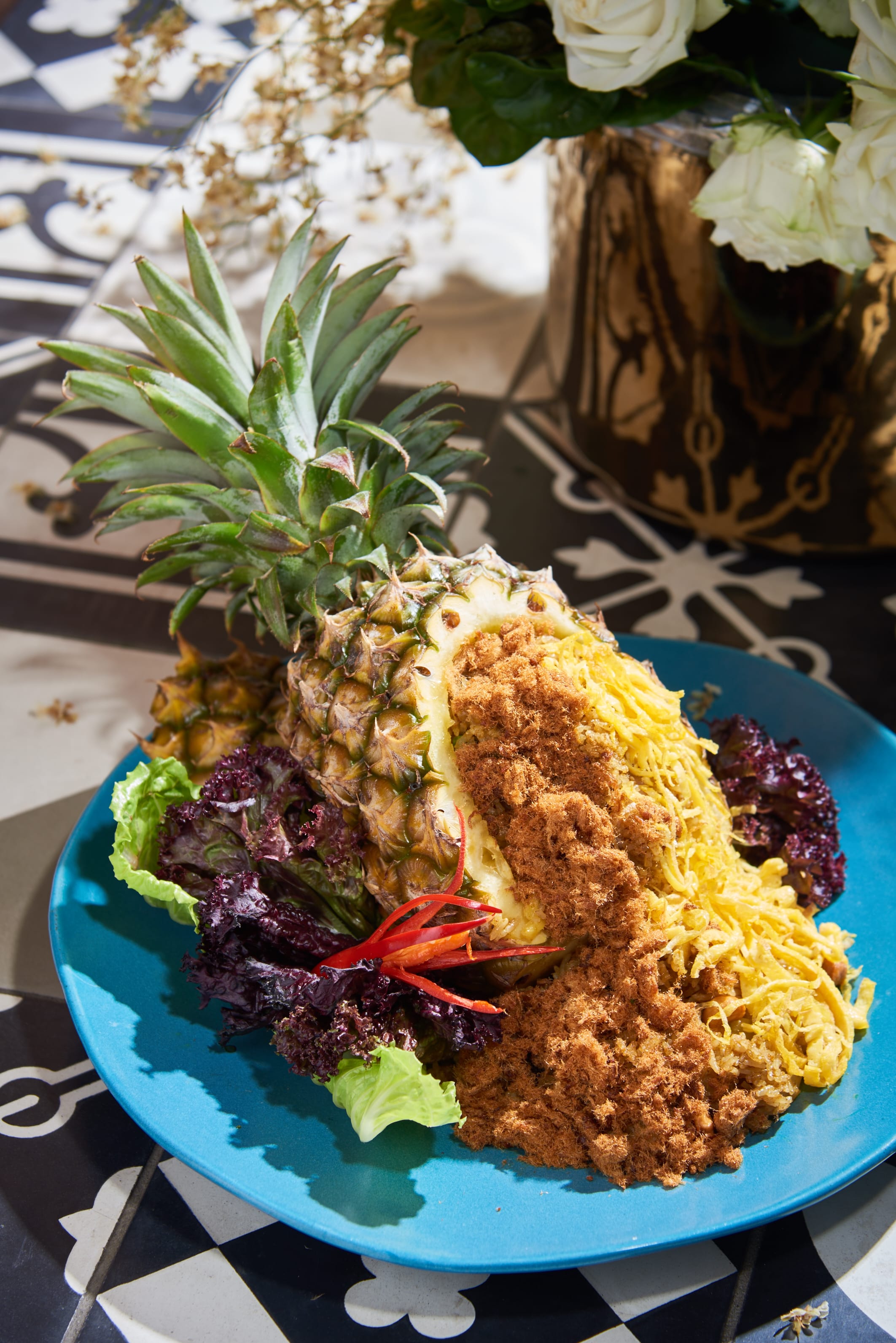 ▲ 大器的直接使用半顆鳳梨入菜,搭配肉鬆和蛋絲炒飯,擺盤更豪氣直 接使用鳳梨作碗。