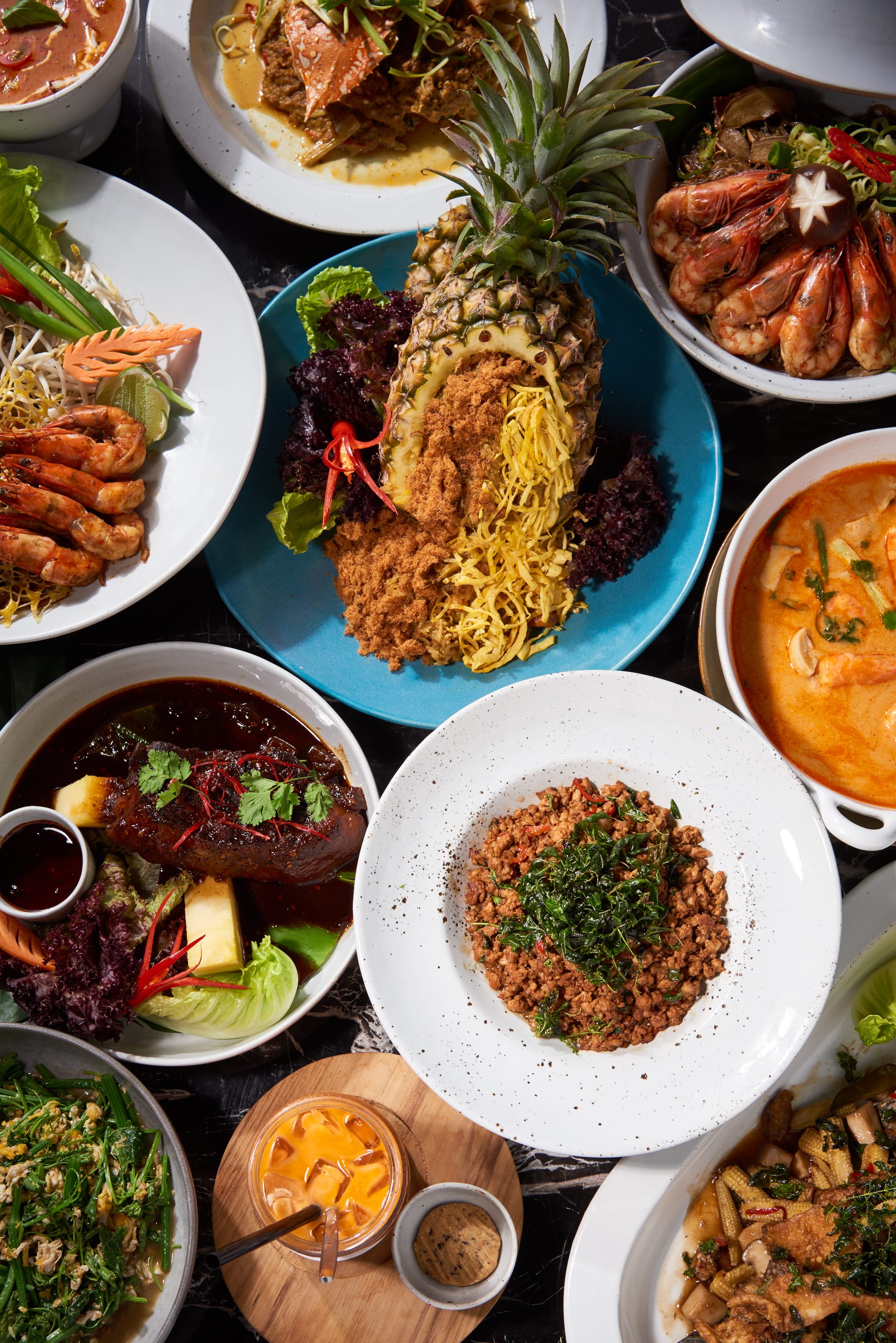 其他好菜,如金黃酥脆的「泰式鮮蝦炸春捲」用泰國傳統辛香料醃製 豬肉內餡加上鮮蝦,外層使用春捲皮油炸,配上泰式甜雞醬品嚐, 酸甜滋味齒頰留香!「鮮蝦粉絲煲」也是餐廳人氣餐點, 貼心將每隻大蝦腸泥清除乾淨,以大火拌炒讓冬粉吸飽濃郁湯汁, 吃一口就讓人驚呼一聲「woo」!餐點道道精彩, 還有滿滿大塊花枝魚肉鮮蝦酸甜開胃的海鮮沙拉、濃郁下飯的紅咖哩 燉鴨、整整半顆新鮮鳳梨裝盛的鳳梨炒飯、滑順甜菜根紅絲絨蛋糕, 都是在台灣很少吃到的泰北風味料理!
