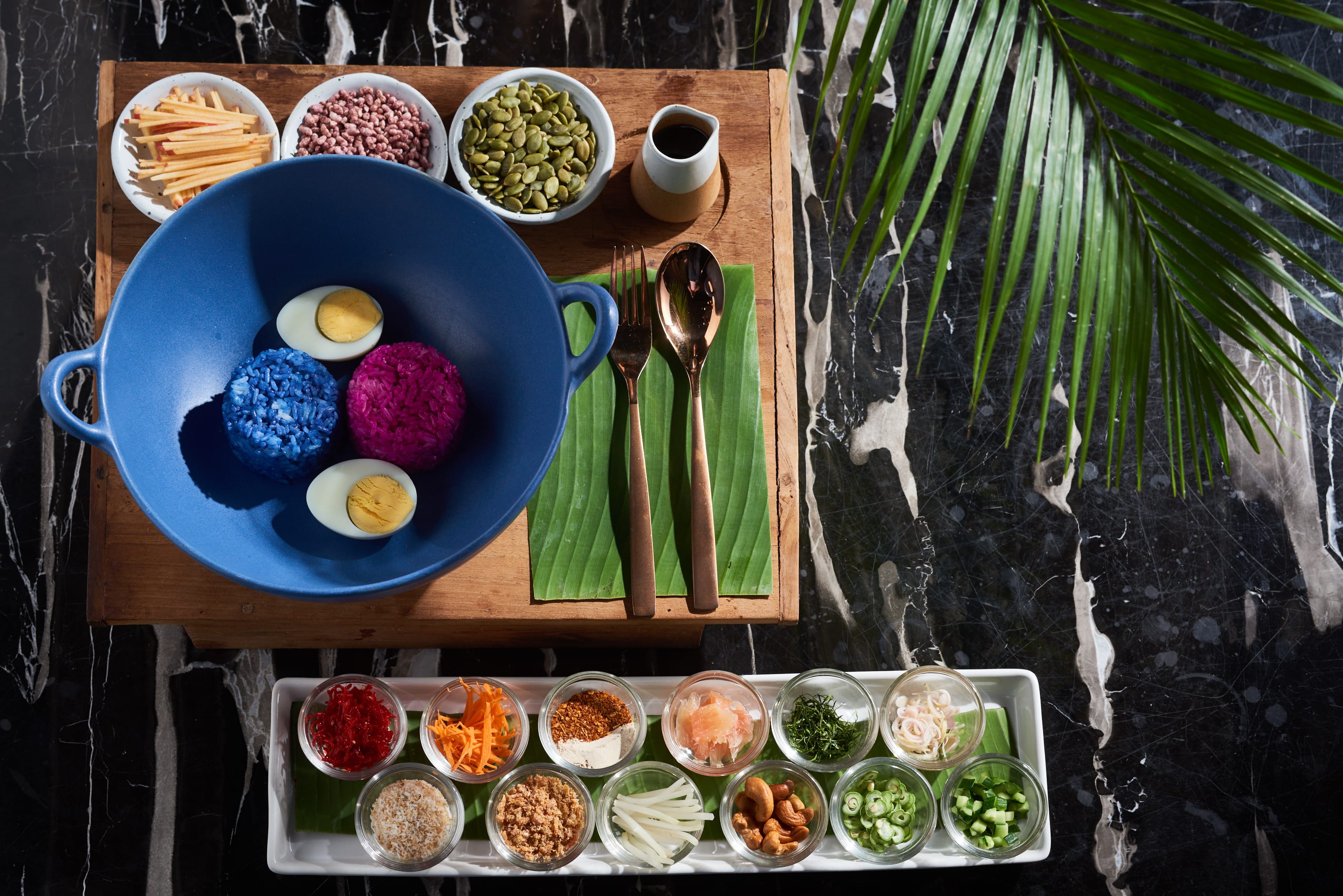 ▲ 完全不含色素,以蝶豆花和紅龍果製作成的雙色米,多達15種配料 拌勻後品嚐,口感豐富層層刺激味蕾。