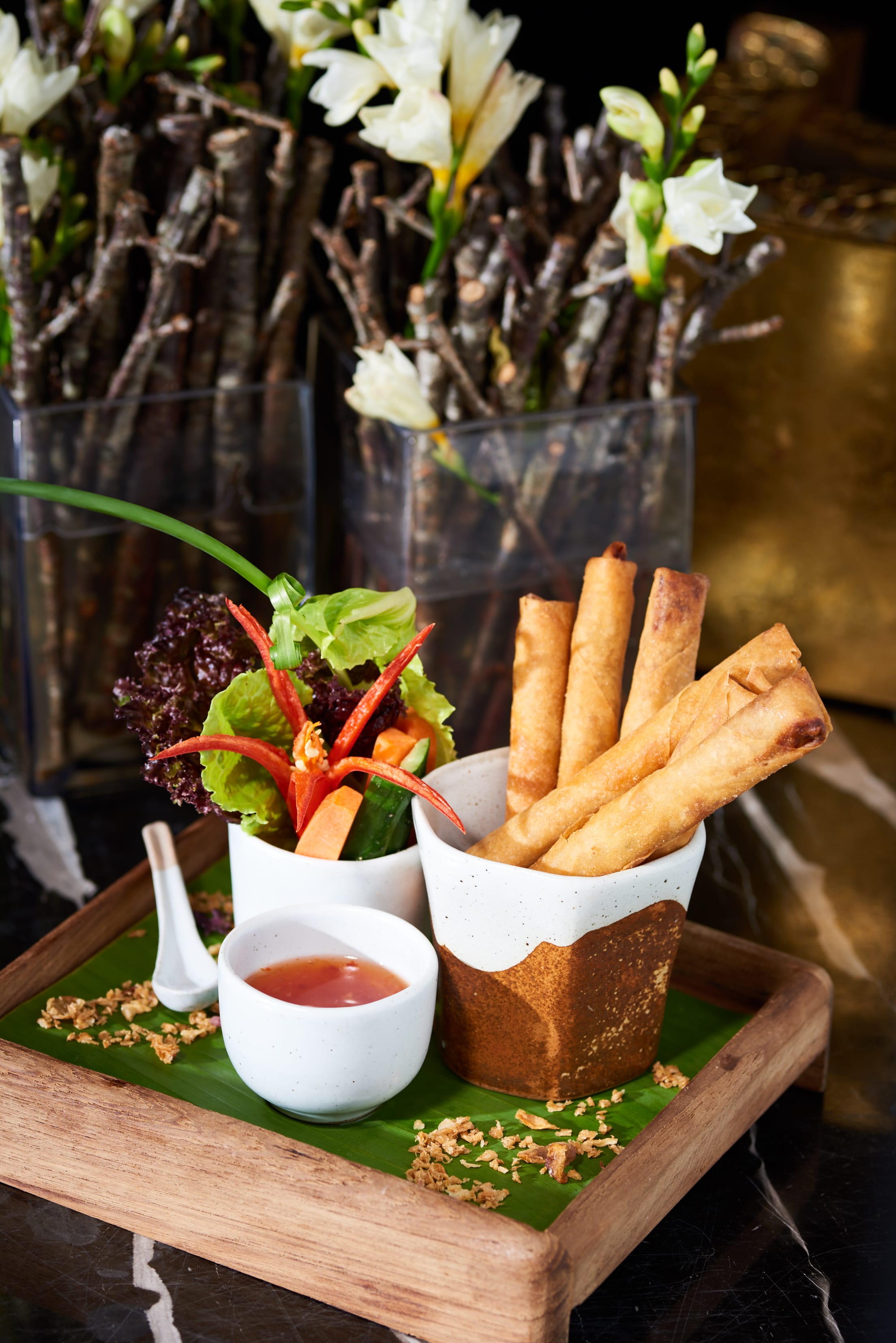 ▲ 金黃酥脆的「泰式鮮蝦炸春捲」用泰國傳統辛香料豬肉內餡加上鮮蝦 ,春捲皮包起油炸,配上泰式甜雞醬品嚐,酸甜滋味齒頰留香。
