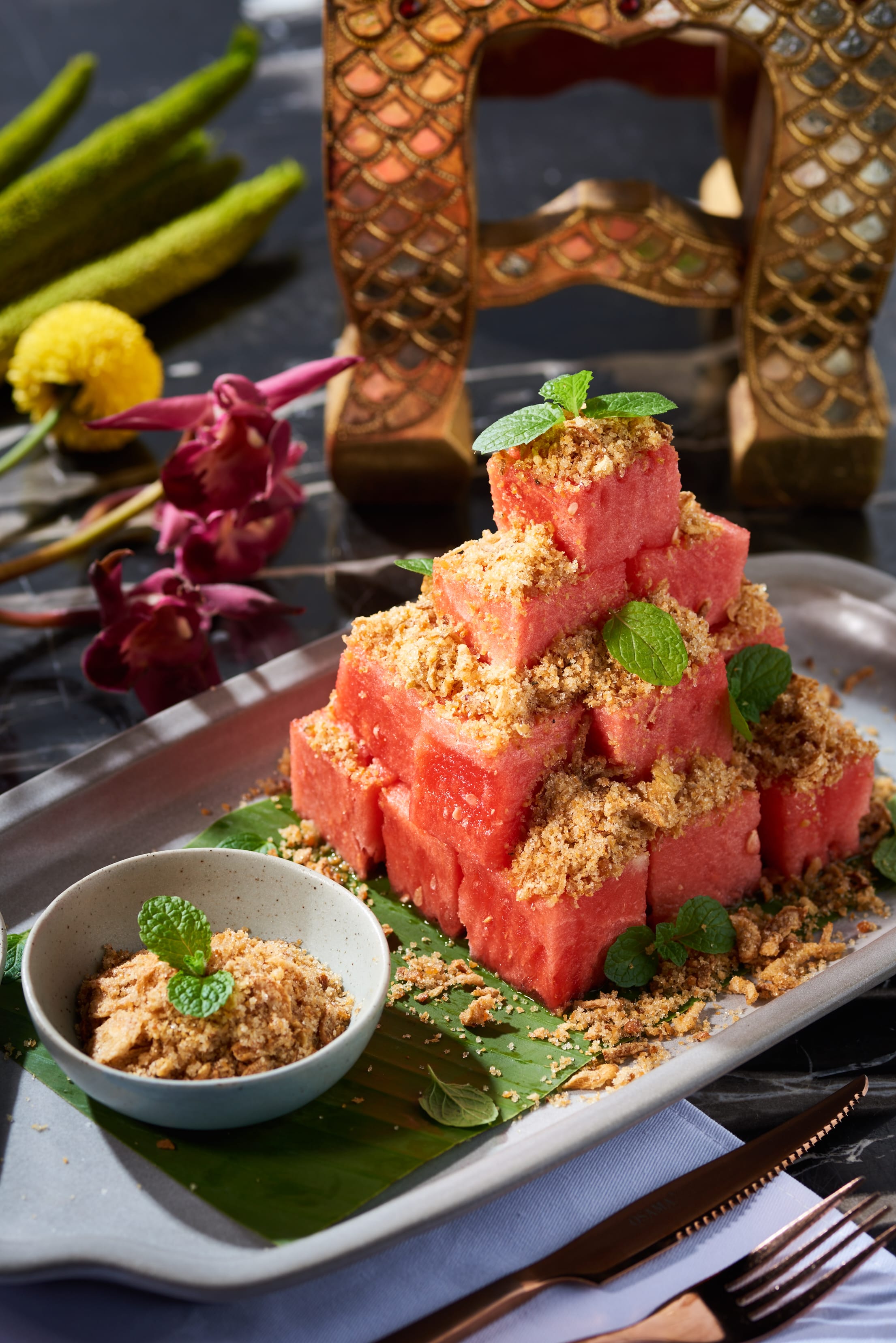 ▲ 這道泰國宮廷名菜,是將鯰魚烤乾成酥後打成粉,拌入砂糖加上薄荷 葉撒在西瓜上,不同口感的食材,卻恰到好的融合在嘴裡。