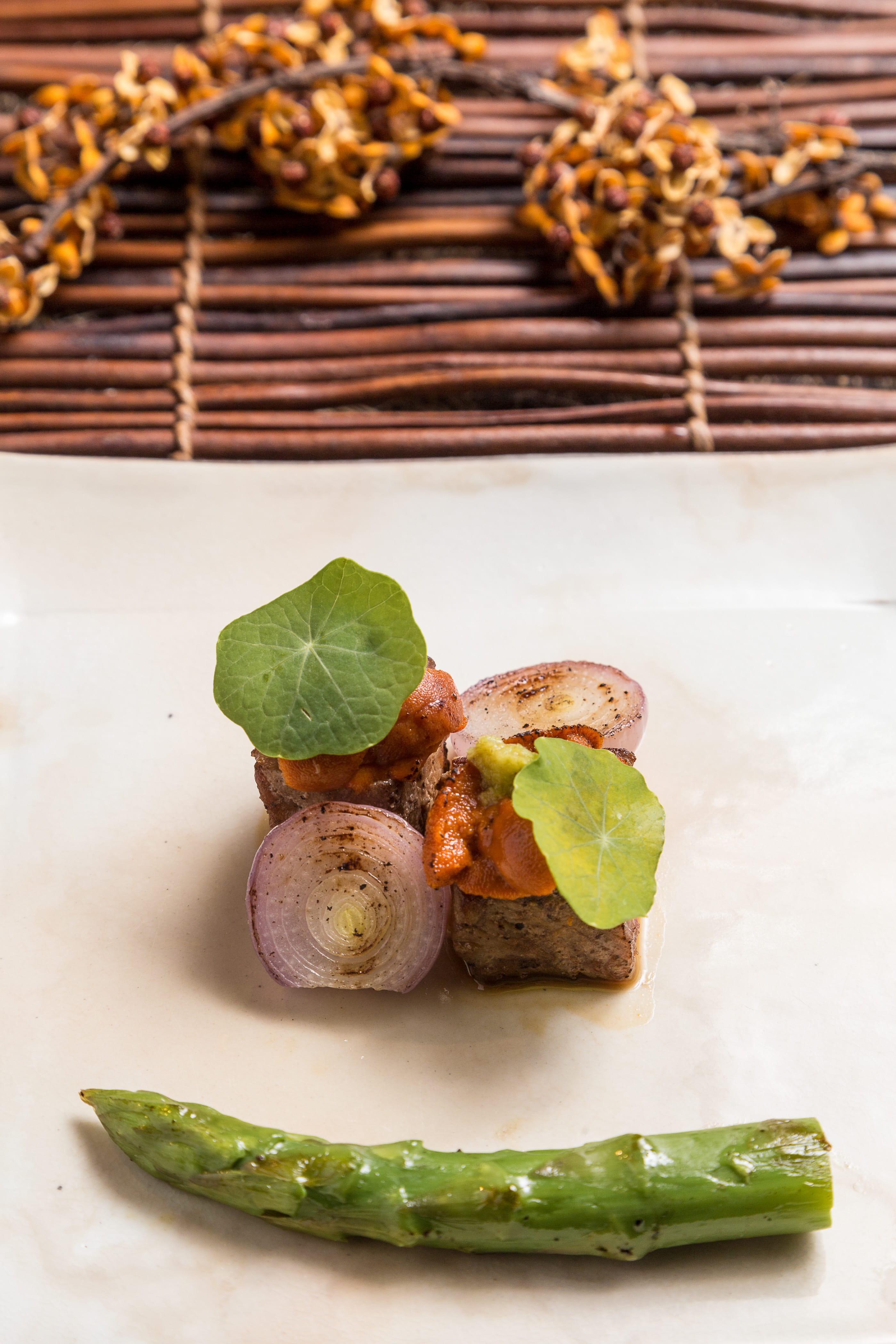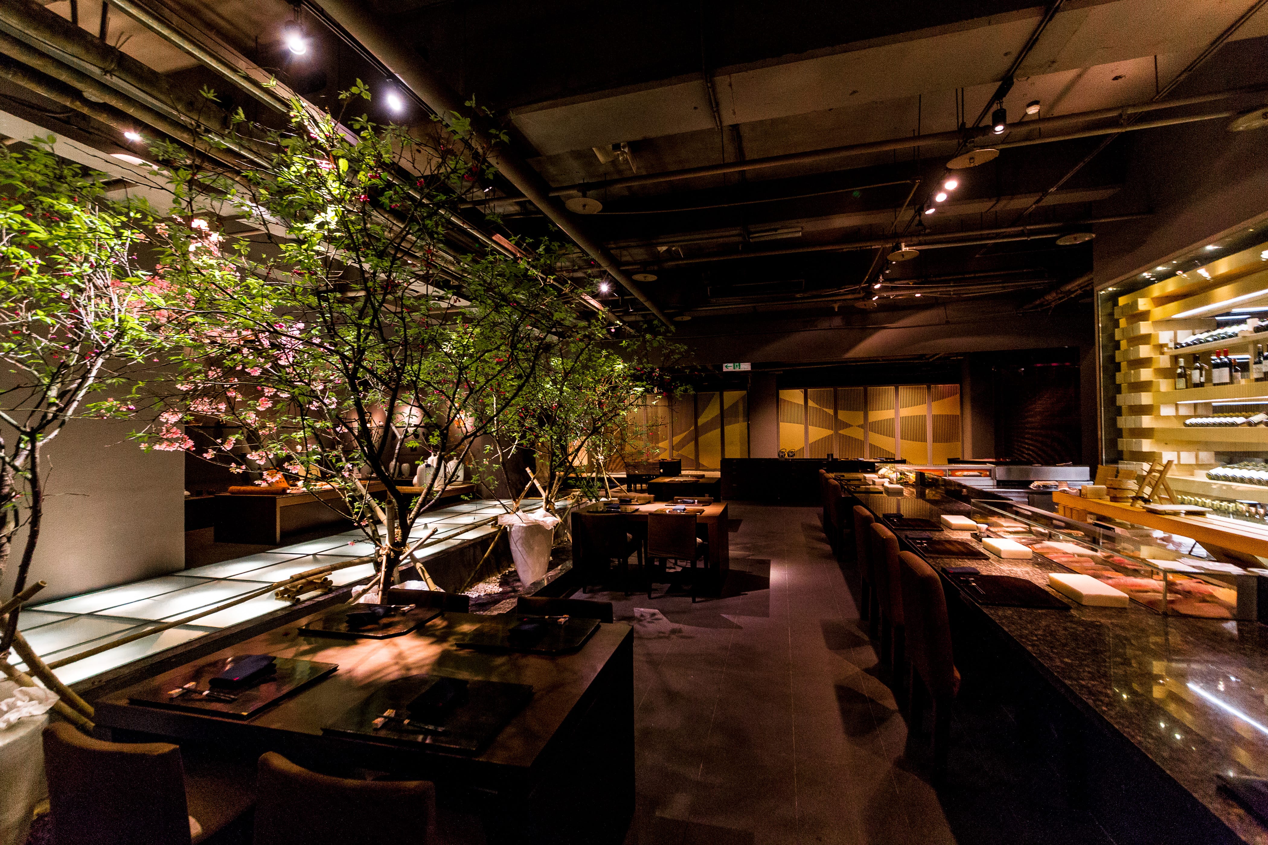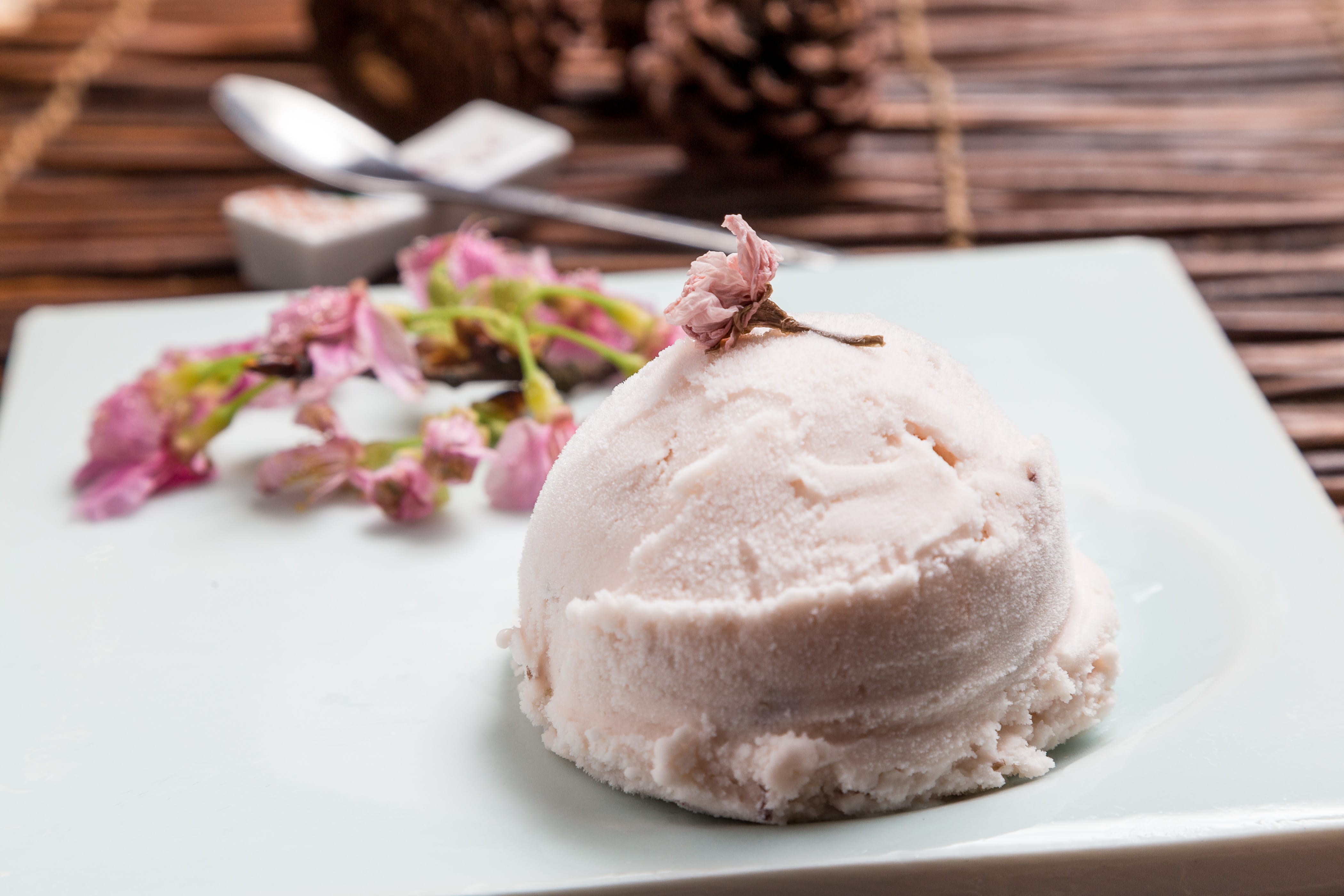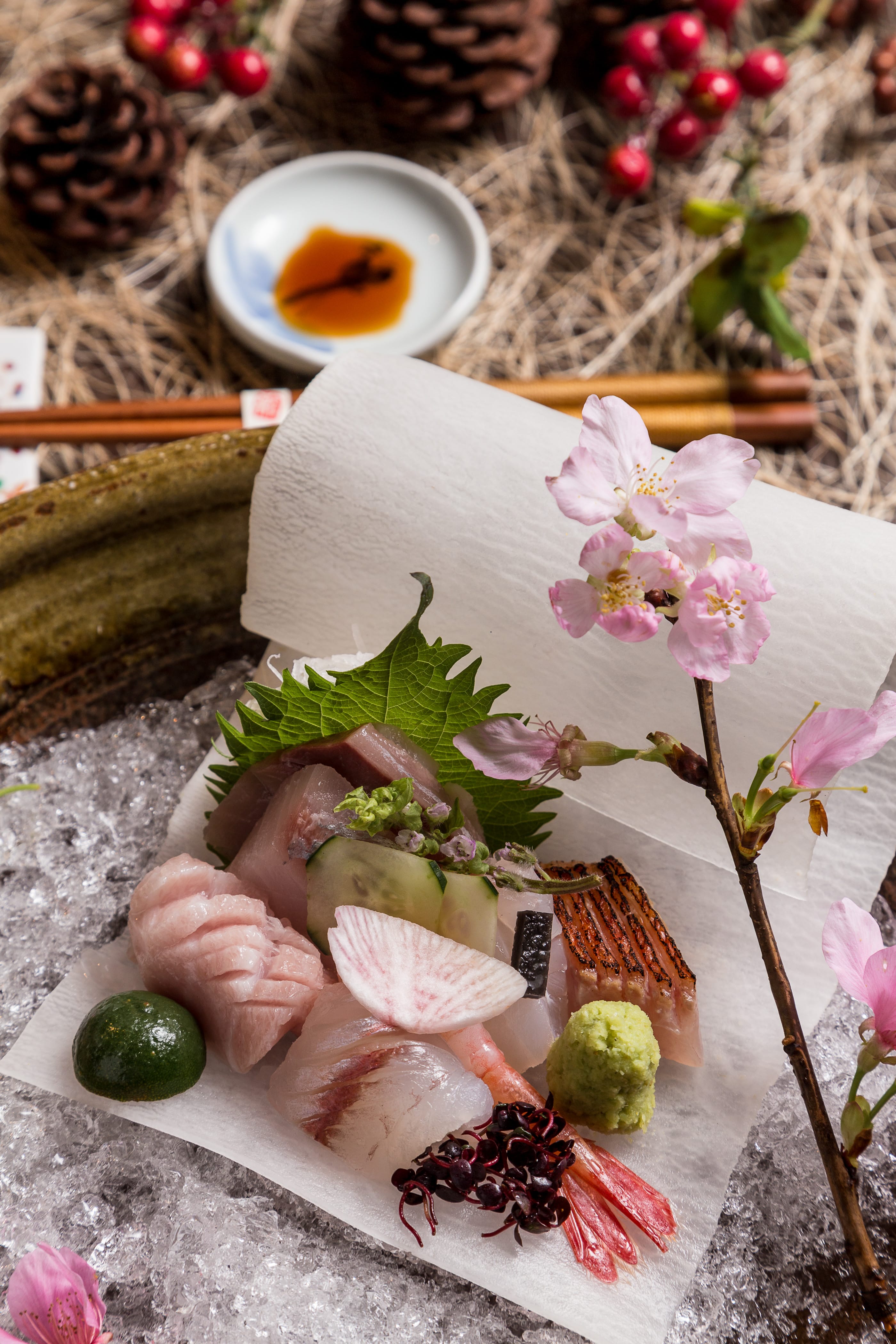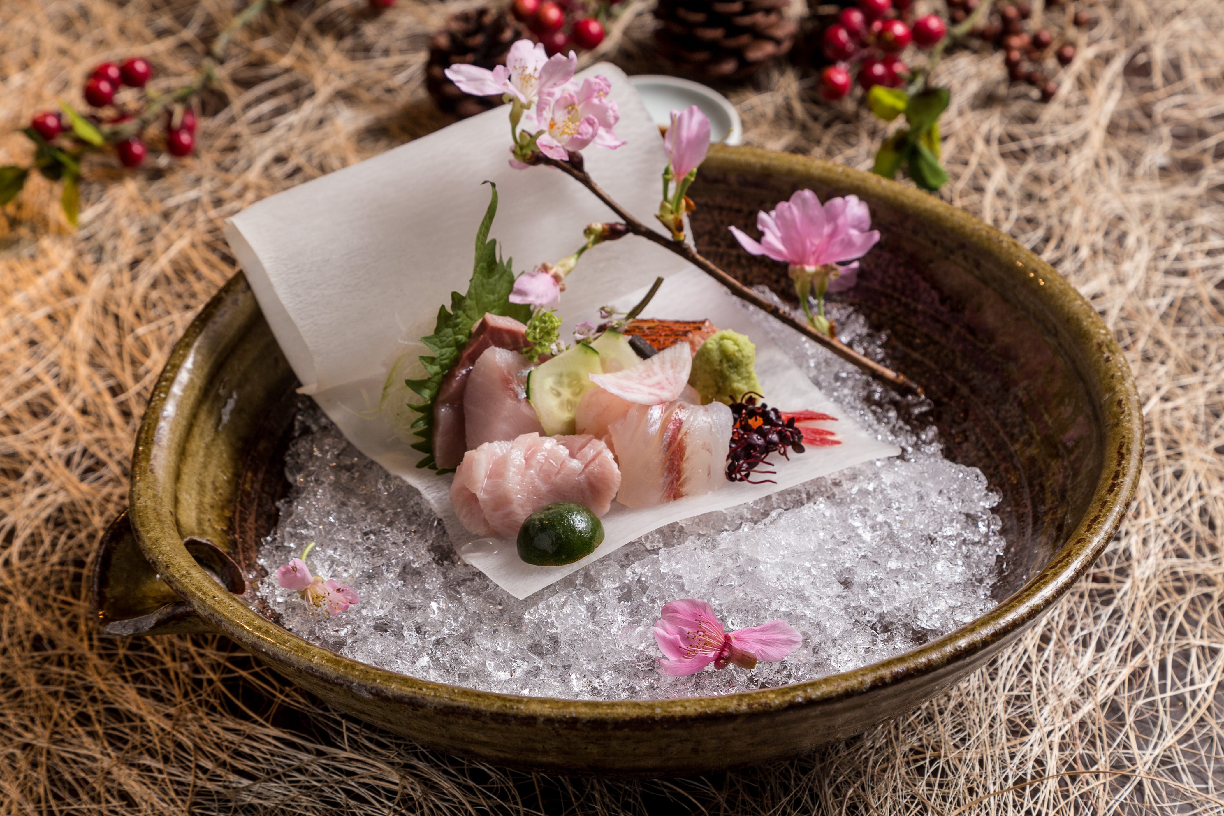 烤品「餘櫻繚繞」,甘鯛使用櫻花葉醃製魚身,再以若狹燒方式烹調,鱼鳞挺、口感脆、帶點櫻花香,是一道極細膩料理。香煎日本和牛與海膽炙燒後點上些許芥末,特品「春櫻旖旎」看似衝突卻更加融合。食事「花見薈萃」,溫壽司鋪上各式色彩鮮艷食材,如春之色落入盤中令人食指大動,最後甜品「唇若點櫻」,粉色酒粕冰淇淋融入吟釀香、櫻花汁、梅子等多層次的甜鹹口感,這整套吃下來備感尊榮與滿足。