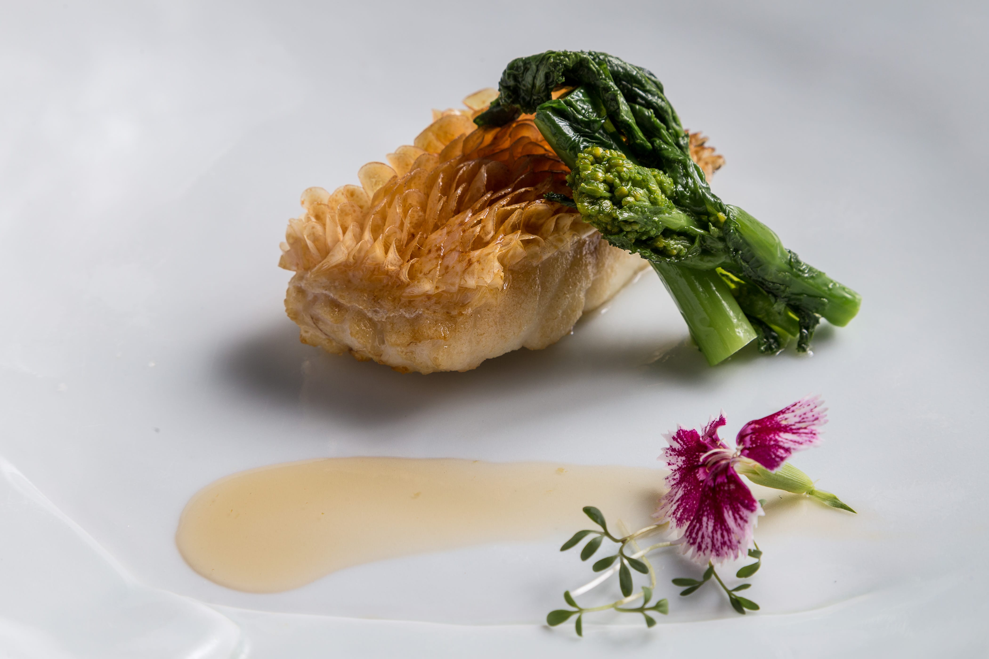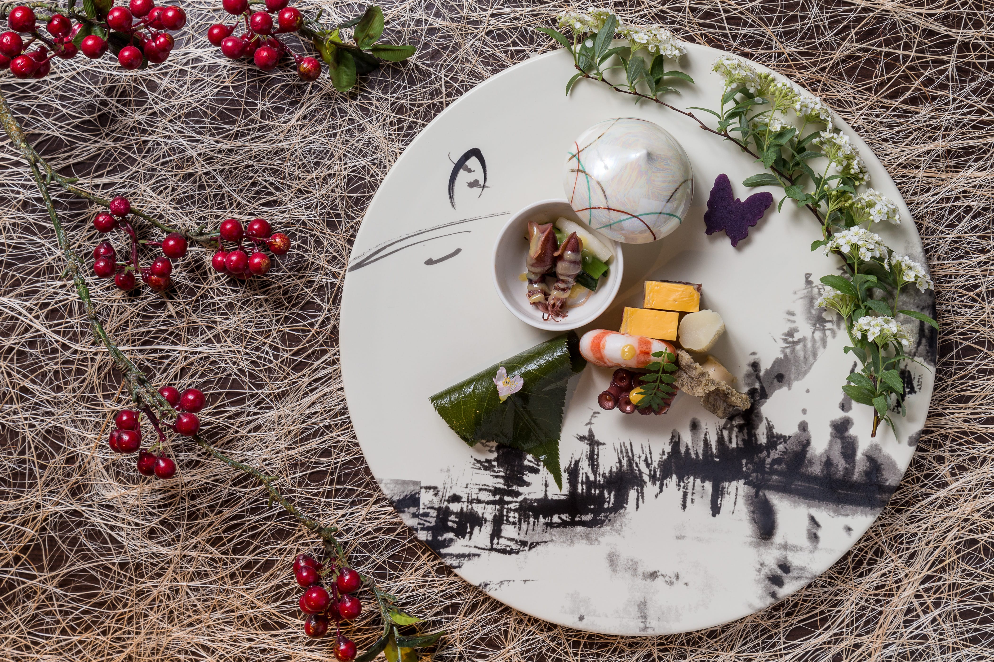 以〝御見・幸福〞為主題發想,嚴選當令食材再運用櫻花等花材陪襯或入菜,加上精緻擺盤,林俊名料理長想要帶給賓客滿滿的春天喜悅。飾以水墨畫裝盤的前菜「春櫻緣結」,由多種袖珍小點組成,柔軟章魚、多點奶味的蔓越莓起司、當季法國白蘆筍、紫芋蝴蝶等,加上手毬花點綴,款款細巧,忍不住先讓手機吃了。