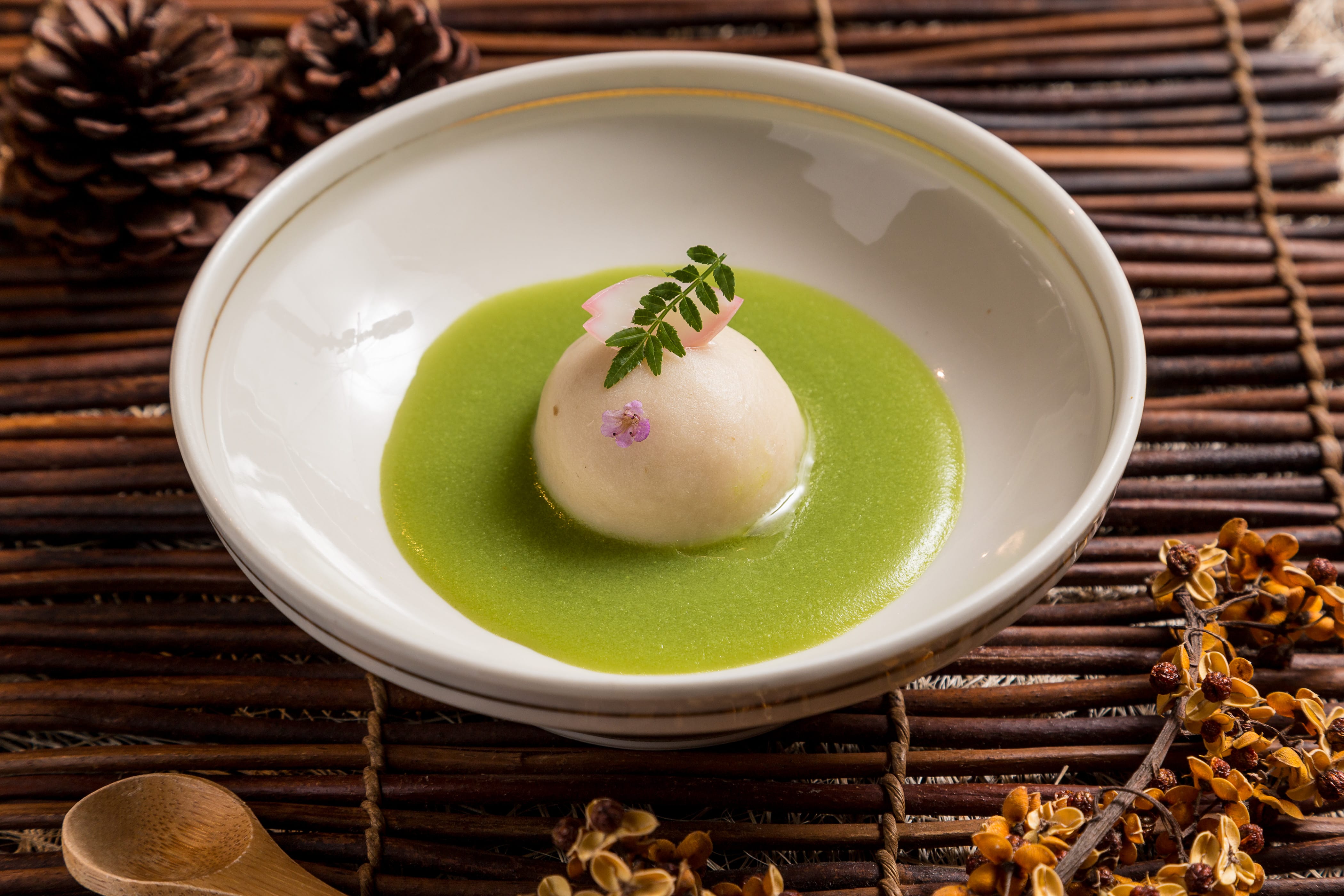 椀物是懷石料理的靈魂,喝一口湯即能知道師傅的功夫底子,「合合美美」只是單純的一番高湯與大蛤蠣及些許青蔬,清新高雅口感,更開啟了好胃口。生品「囍‧花嫁」,似如打開雪白紗,以櫻花葉與綠色瓜類襯托上等季節魚材,這入口即化的柔軟,怎一個鮮字了得!相當費工的煮品「花弄春泥」,高湯融合碗豆泥,浸著百合根泥、芋泥及雞肉泥揉成的丸子,格外細膩綿密,綠色妝點上由百合根製成的櫻花瓣,這畫面美極了。