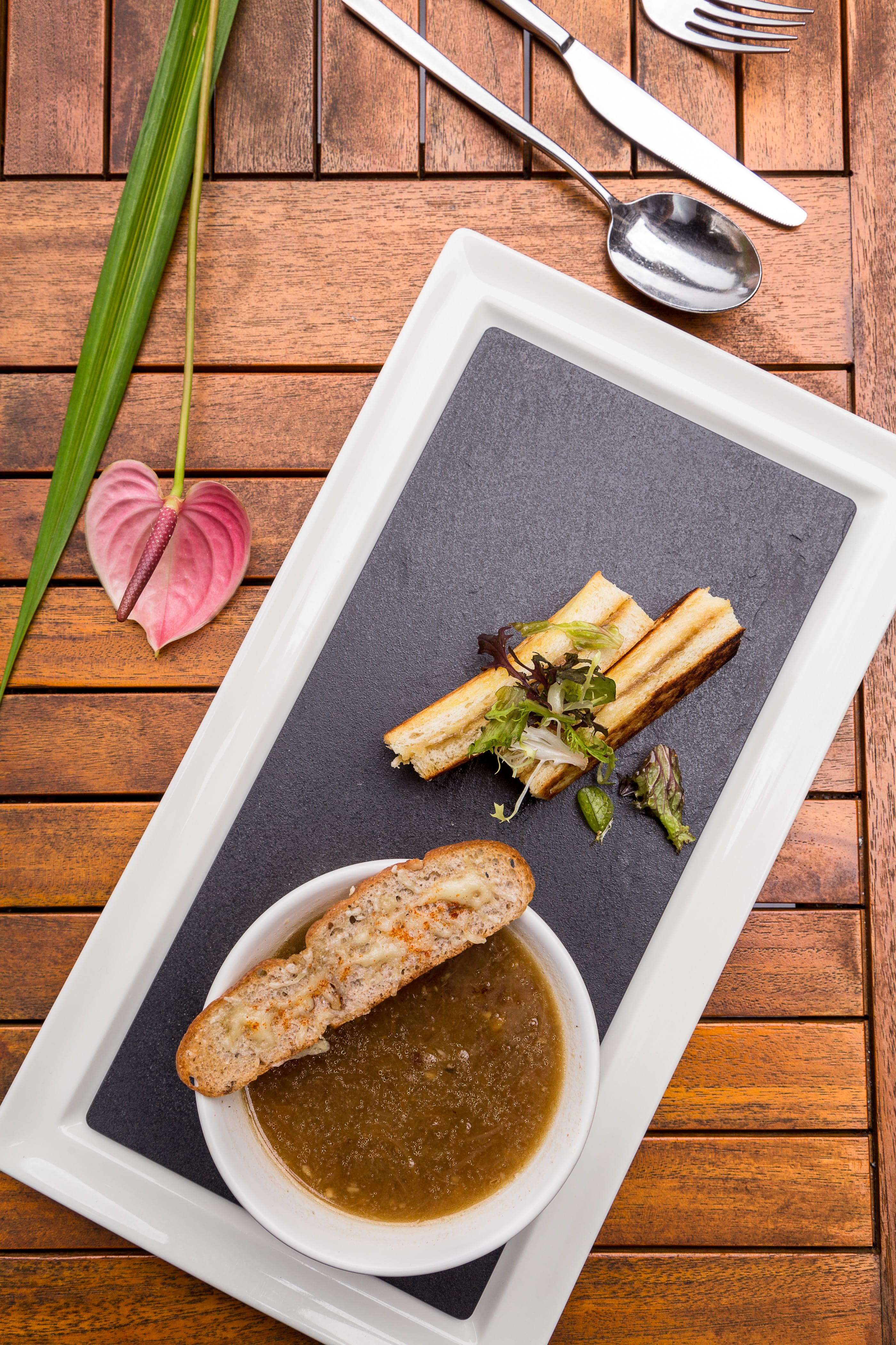 只喜歡喝湯嗎?那千萬要點上一碗法式洋蔥湯附乳酪三明治。特選來自屏東的大顆洋蔥,以鹽、月桂葉、胡椒調味,費工的以小火炒了3、4個小時,成為泥膏狀,再倒入牛高湯,組合牛骨髓熬煮的碎牛肉,哇!這湯頭料多又濃郁,忍不住一口接一口喝到見底,搭配抹上洋蔥泥及奶油的三明治,對於不想吃太多的人來說,這一餐吃起來沒有負擔,洋蔥的精華都在裡面了。