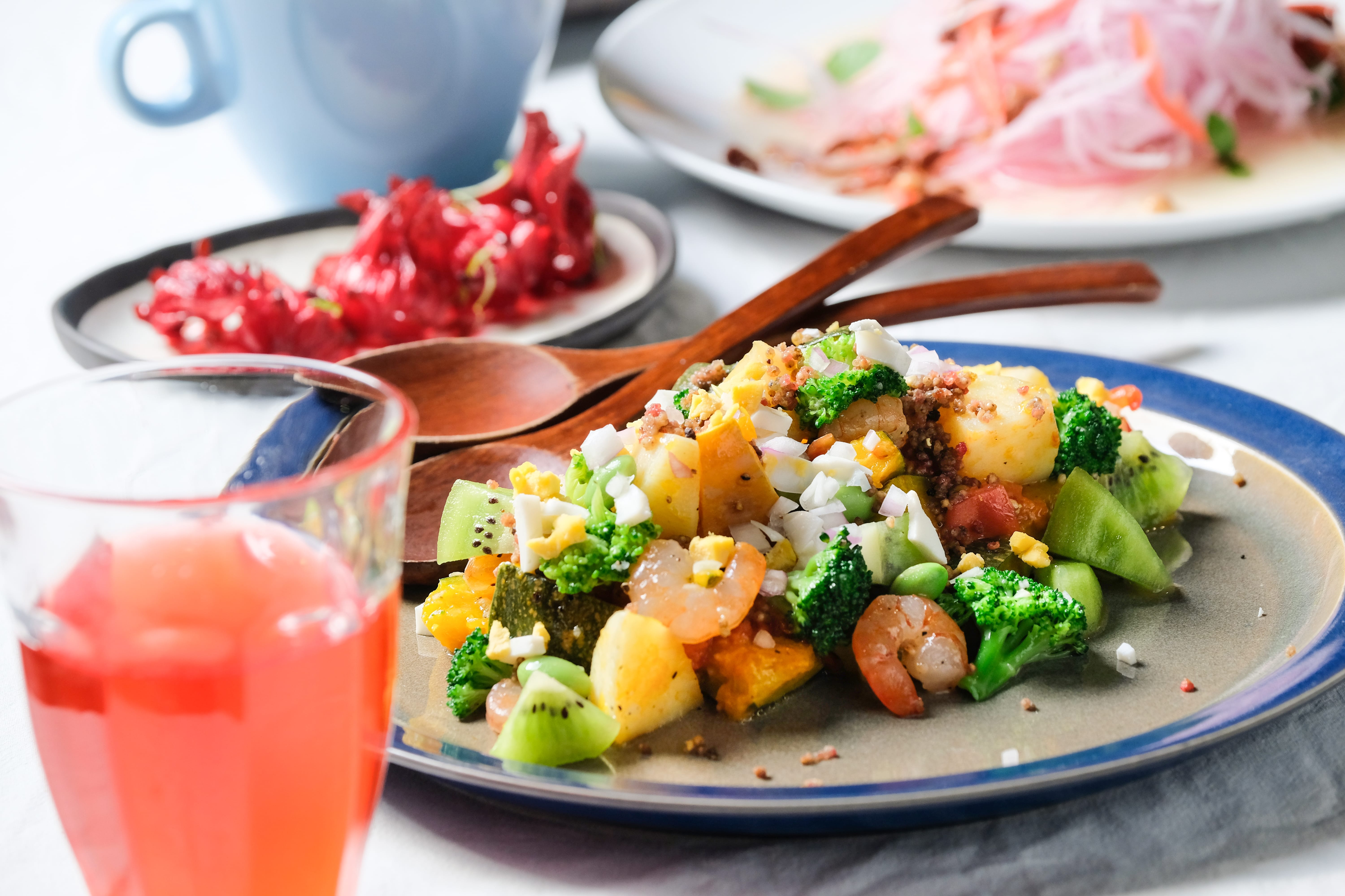 露天晚餐採取預約制,共10道菜包含甜點,每一份餐點都連結著對部落情感的記憶。時蔬溫沙拉以獵人的背包做發想,放入了南瓜、馬鈴薯、花椰菜、蝦仁、紅藜…等各種營養食材,成為最澎派的開胃菜。阿美族經常採集野菜食用的傳統,也搬到餐桌上重新展演,將清燙的過貓加上花生粉、芥末醬,成為口感清爽卻帶有嗆辣滋味的料理。