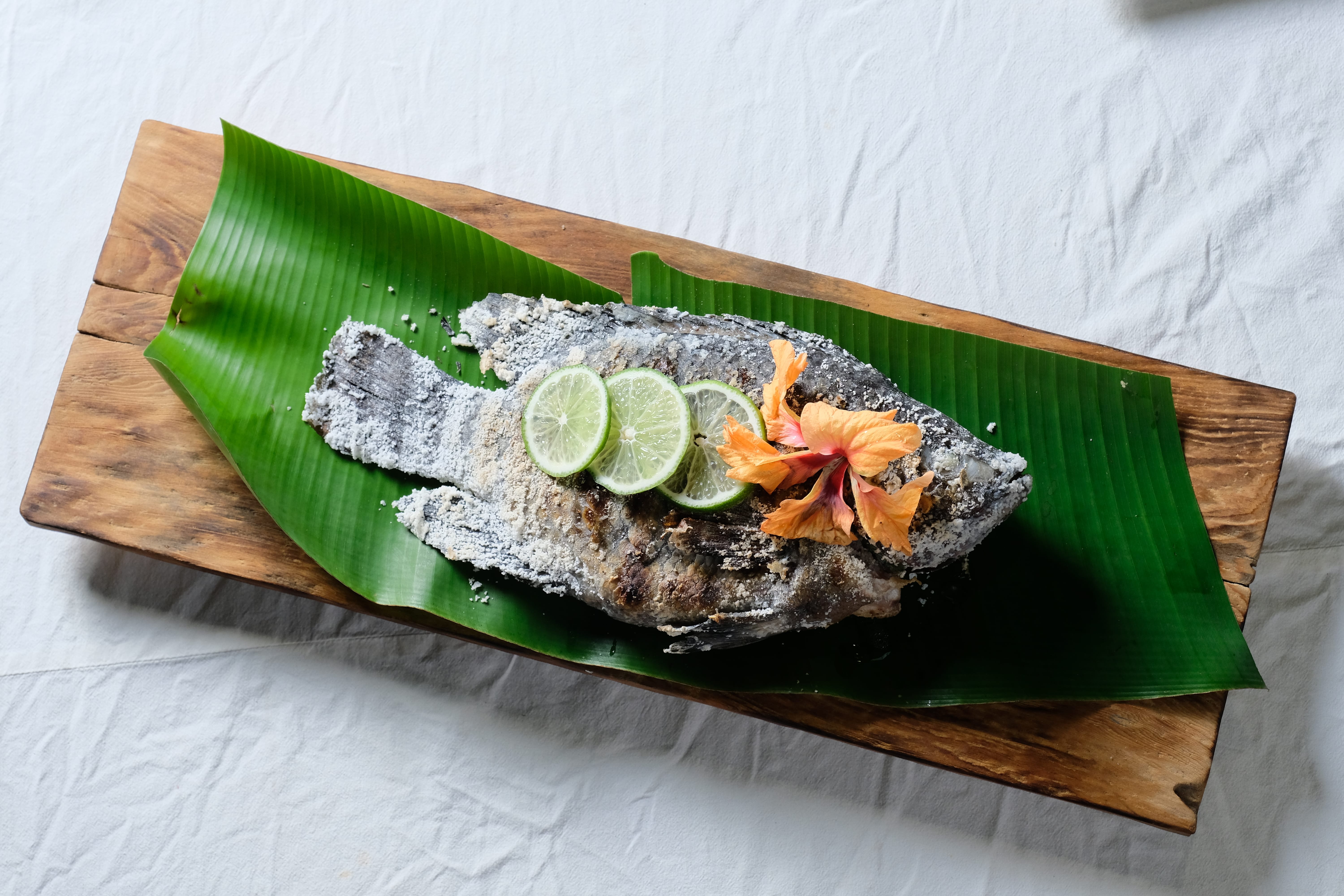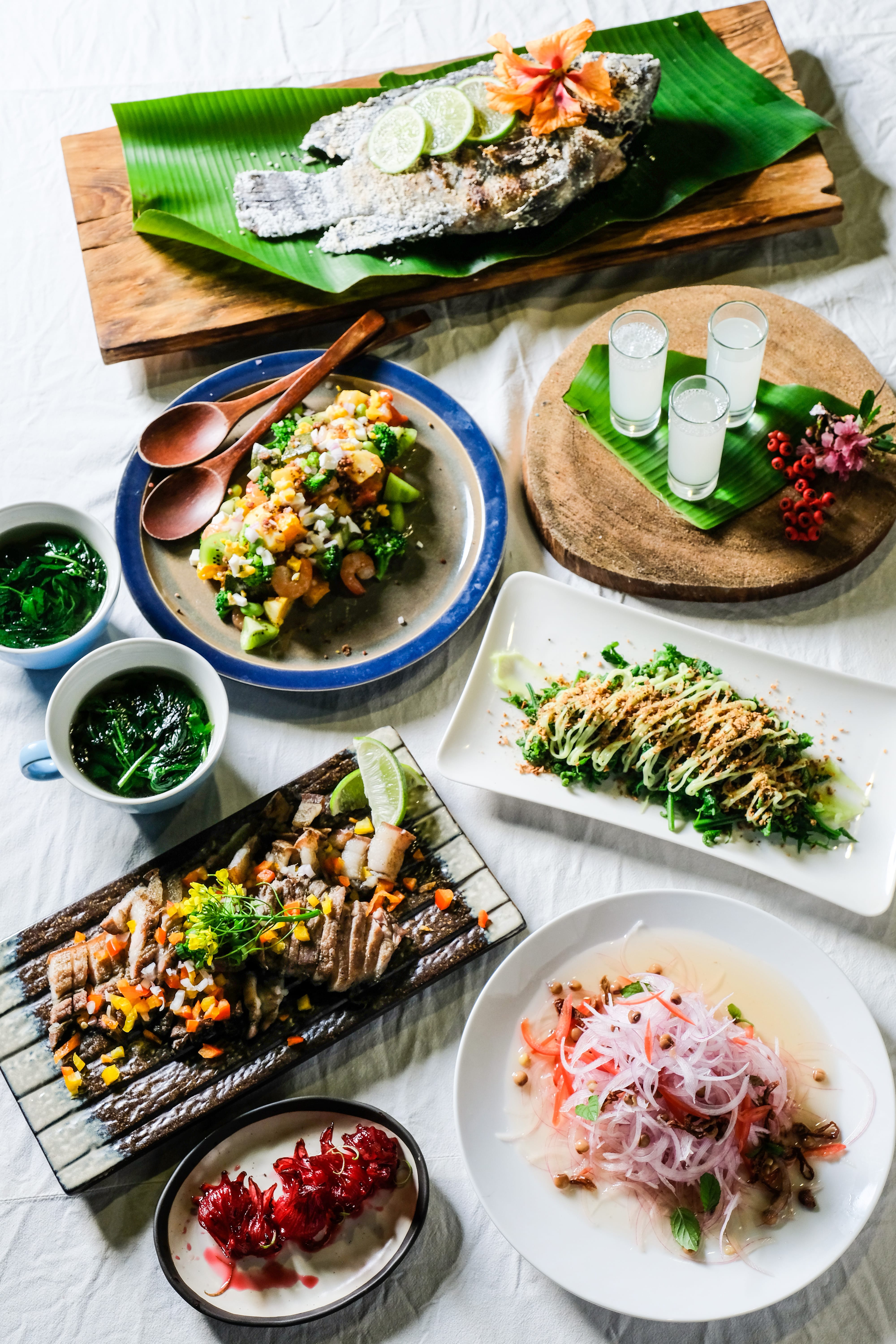 主菜部落鹽烤魚、香烤豬肉陸續豪邁上桌,魚肉多汁鮮嫩並帶有刺蔥的辛香,烤豬肉的風味則是豪邁卻充滿層次,搭配洛神花果乾及特製小米酒,頓時鹹香酸甜各種滋味在口中蔓延,飽足口腹也滿足心靈。
