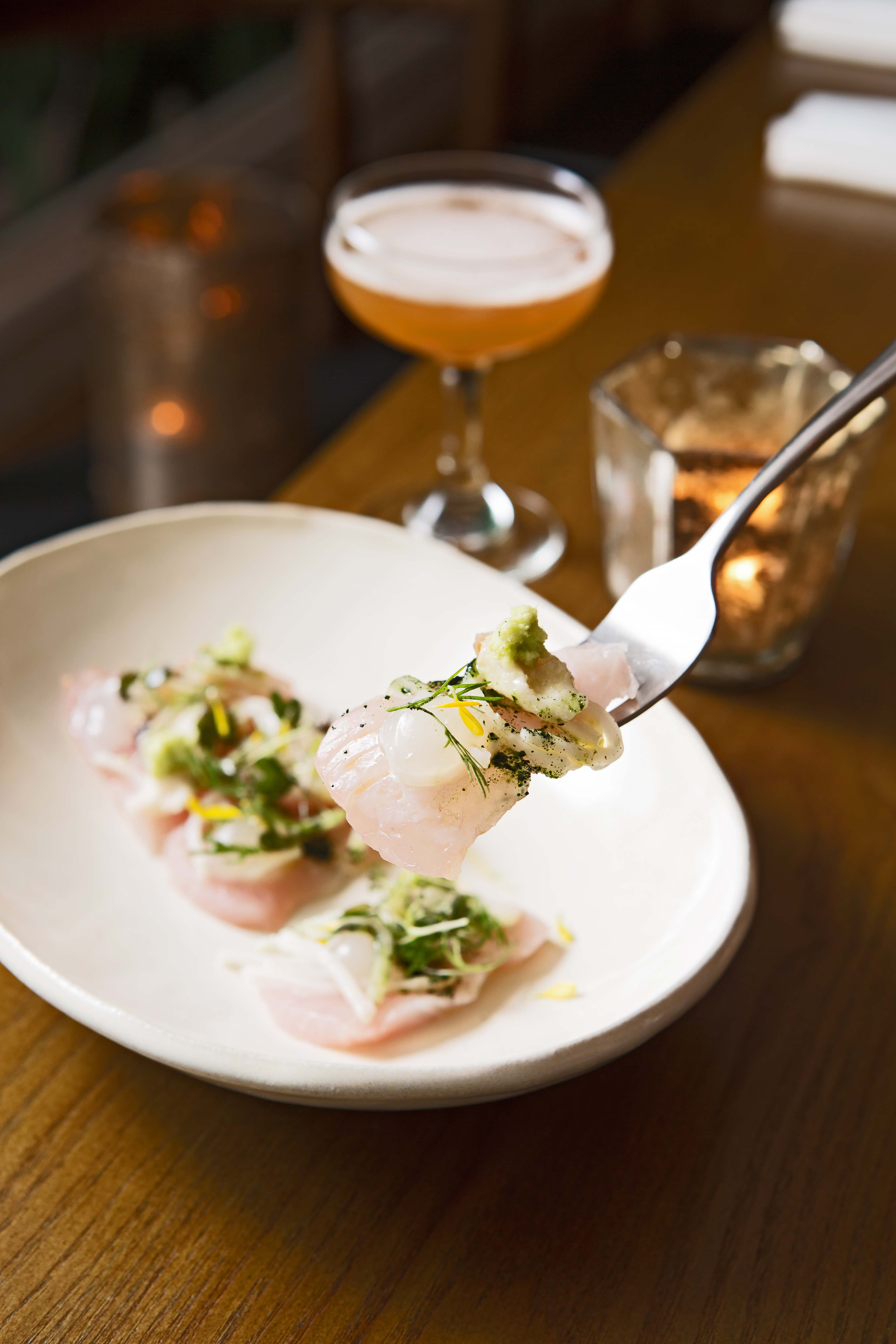 將肥美的紅甘生魚片端上餐桌,輔以台東太麻里釋迦,兩種柔軟卻不盡相同的甜味口感,堆疊出迷人的香氣。然而,Kin最擅長的部份在於,只消品嘗一口就能擄獲饕客味蕾,因此微酸的萊姆果凍、微辛的芥末、自家醃漬的酥脆大頭菜,都能共同在口中展演美妙的滋味。