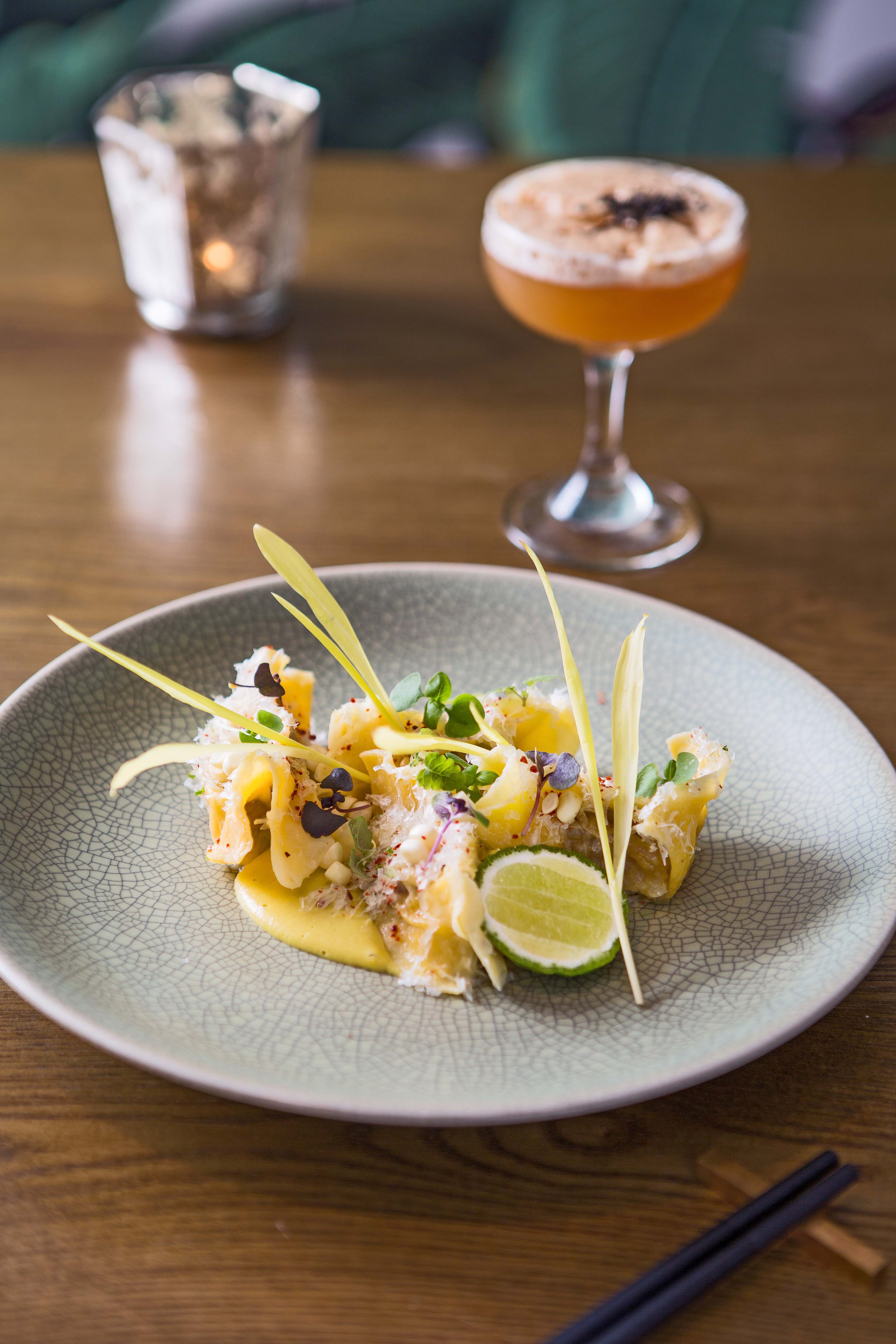 鴨肝餃與法式咖椰土司更是創意料理的另一道巔峰。鴨肝餃使用自製的義大利餃皮,除了雞蛋與牛奶,更揉入了鹹蛋黃,增添令人難以忘懷的香氣。搭佐來自台灣的玉米醬、玉米苗,最後再灑上泰國香檸皮屑,讓原本口中濃郁的鴨肝香,竄出一縷酸甜。