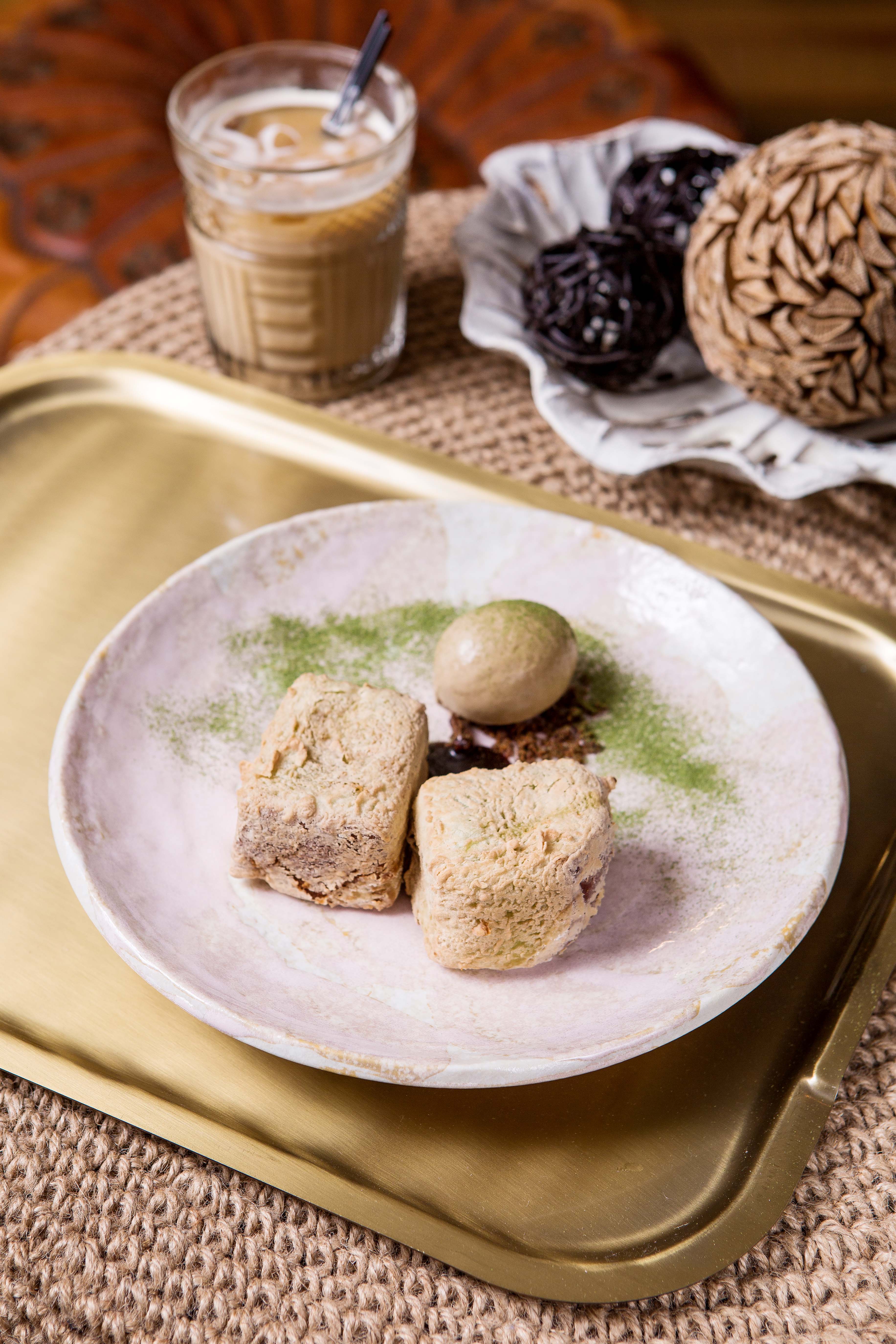 雖是新加坡的咖椰土司,卻以法式土司的做法呈現。先把麵包烘乾再浸泡至以斑斕葉跟椰子打成的漿汁中,靜置一個晚上後如豆腐般軟嫩,再裹粉酥炸,口感雷同中餐的老皮嫩肉,十分新奇。再以焦糖口味的醬油,跟咖啡冰淇淋來平衡甜鹹比例,打造不油不膩的創意甜點。