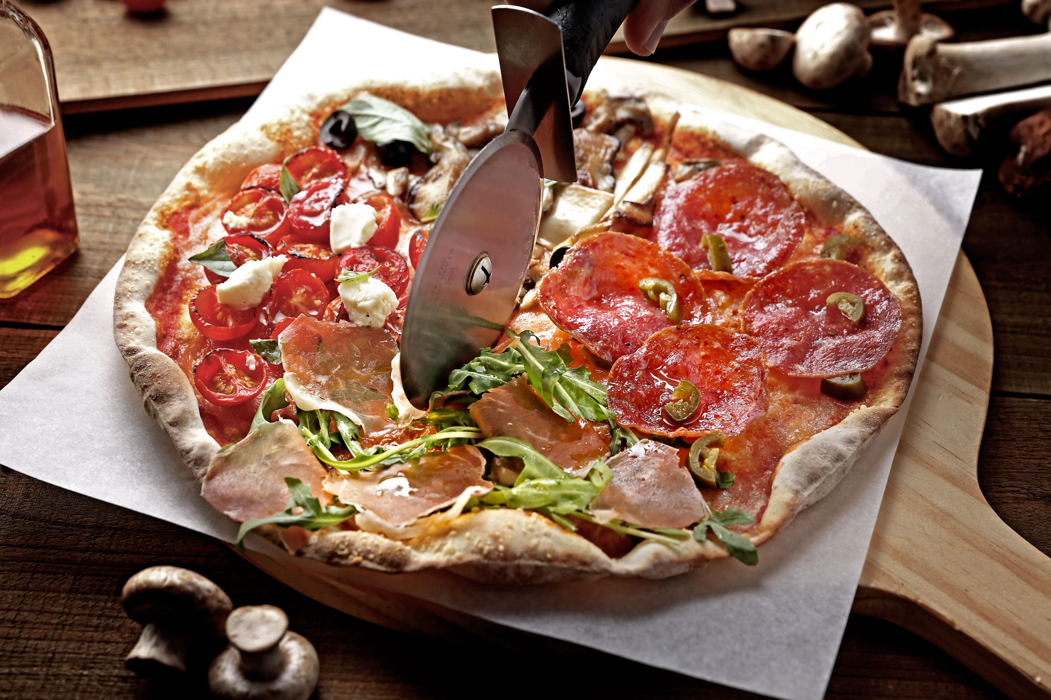 享譽國際的義大利披薩,實際上並非僅有眾人熟悉的拿坡里披薩種類,越往北義地區探索,越會發現披薩的餅皮變得薄而脆,而這正是Bellini Pasta Pasta日籍顧問伊藤雄次郎所擅長製作的羅馬式披薩。選用日本與義大利麵粉混合,再二次發酵製作為麵糰,將擀得皮薄與自製蕃茄醬為底的羅馬式披薩為基礎,透過主廚對於四季的想像,選用義式披薩常見的食材作為使用,由芝麻葉與義大利帕瑪區的帕瑪火腿帶來象徵春季的綠意清新;夏季則以滋味酸甜的低溫慢烤蕃茄與莫札瑞拉起士組合出適合與白酒或啤酒一同享用的清爽風味;豐收的秋季則由具和風的洋菇、杏鮑菇、香菇共3種不同秋菇作為秋季饗宴;而適合以肉品囤積的冬季能量,主廚嚴選西班牙進口的伊比利豬義式臘腸與綠橄欖的厚重風味作結,將經典的四季披薩透過不同食材的聚合,再使用高溫窯烤爐並不斷地於爐內旋轉餅皮,達到均衡受熱,使食材均沾染窯烤風味的薄脆口感,完成一道能一次嚐盡4種不同風味的披薩。此外,品嚐時主廚也建議,先將披薩折起或捲起,可適度淋上自家製的特製辣油提味,享受更上乘的層次風味饗宴。