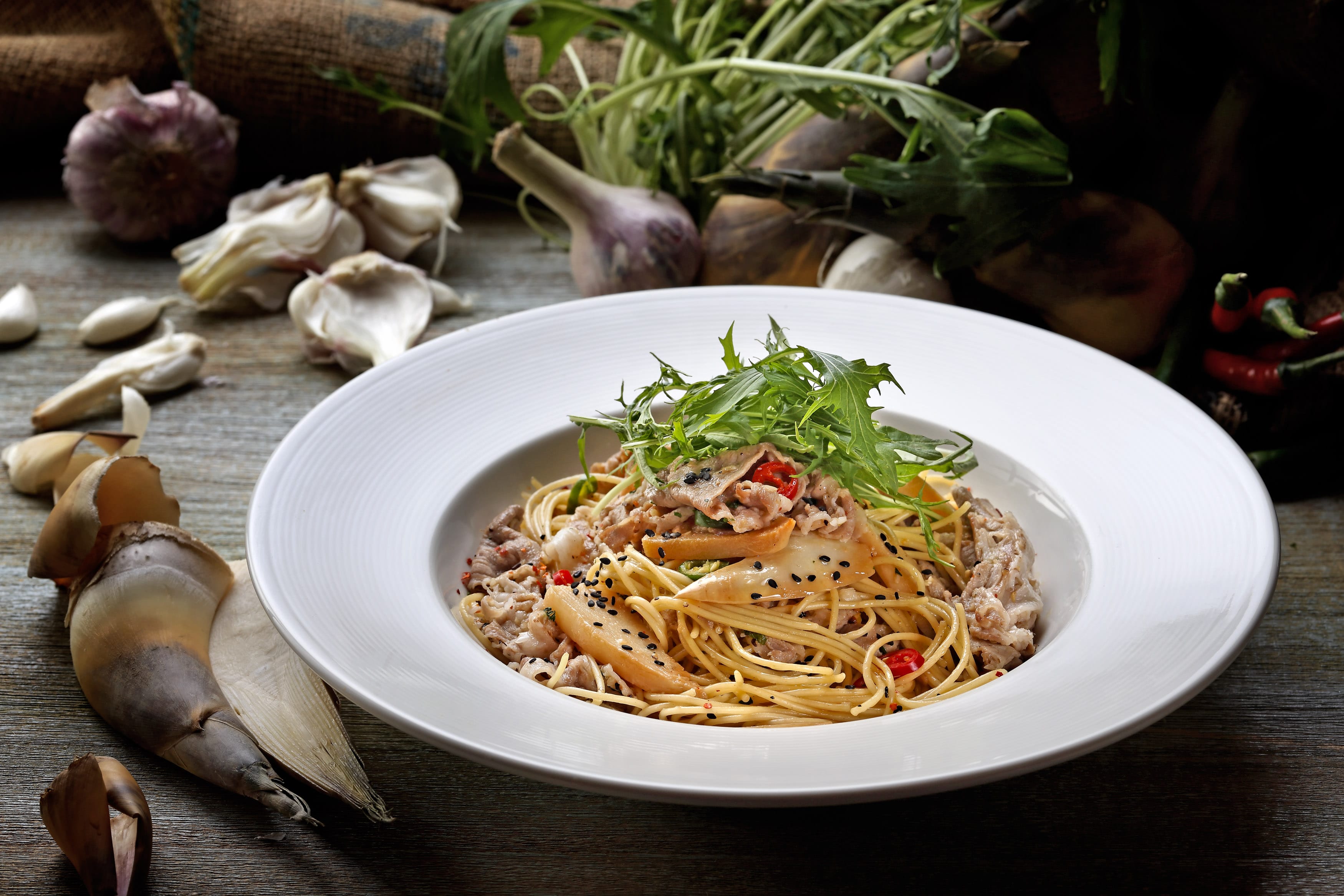 以“東京風”為概念料理的義大利麵,將傳統義大利麵食與和風食材結合,強調出更為溫和的風味,能使亞洲饕客自熟悉的食材裡品嚐來自異國的美食。今年度春季新料理,Bellini Pasta Pasta日籍顧問伊藤雄次郎選擇以南義傳統的清炒香蒜辣椒橄欖油義大利麵(Spaghetti aglio olio e pepperoncino)作為為基礎,再添入和風調味料裡常見的柚子胡椒提出不同層次香氣,配料則以展現季節感十足的春季綠竹筍,以及日本料理中與柚子胡椒最為搭配的豬肉為食材;風味自然輕甜,保水度佳的綠竹筍於醬汁裡展現毫不遜色的美味,為香蒜辣椒基底醬汁帶來溫和的平衡,而使用高科技養殖的品牌豬究好豬,則以油花分布多且肉香濃郁的梅花豬肉料理,吃起來口感鮮嫩,風味十足。值得一提的是,Bellini Pasta Pasta選擇以寬度較細的義大利麵條作為料理,除了可易吸附東京風格的溫和醬汁,更可帶來入口後清爽不負擔的口感,為春季料理揭開新的味蕾饗宴。