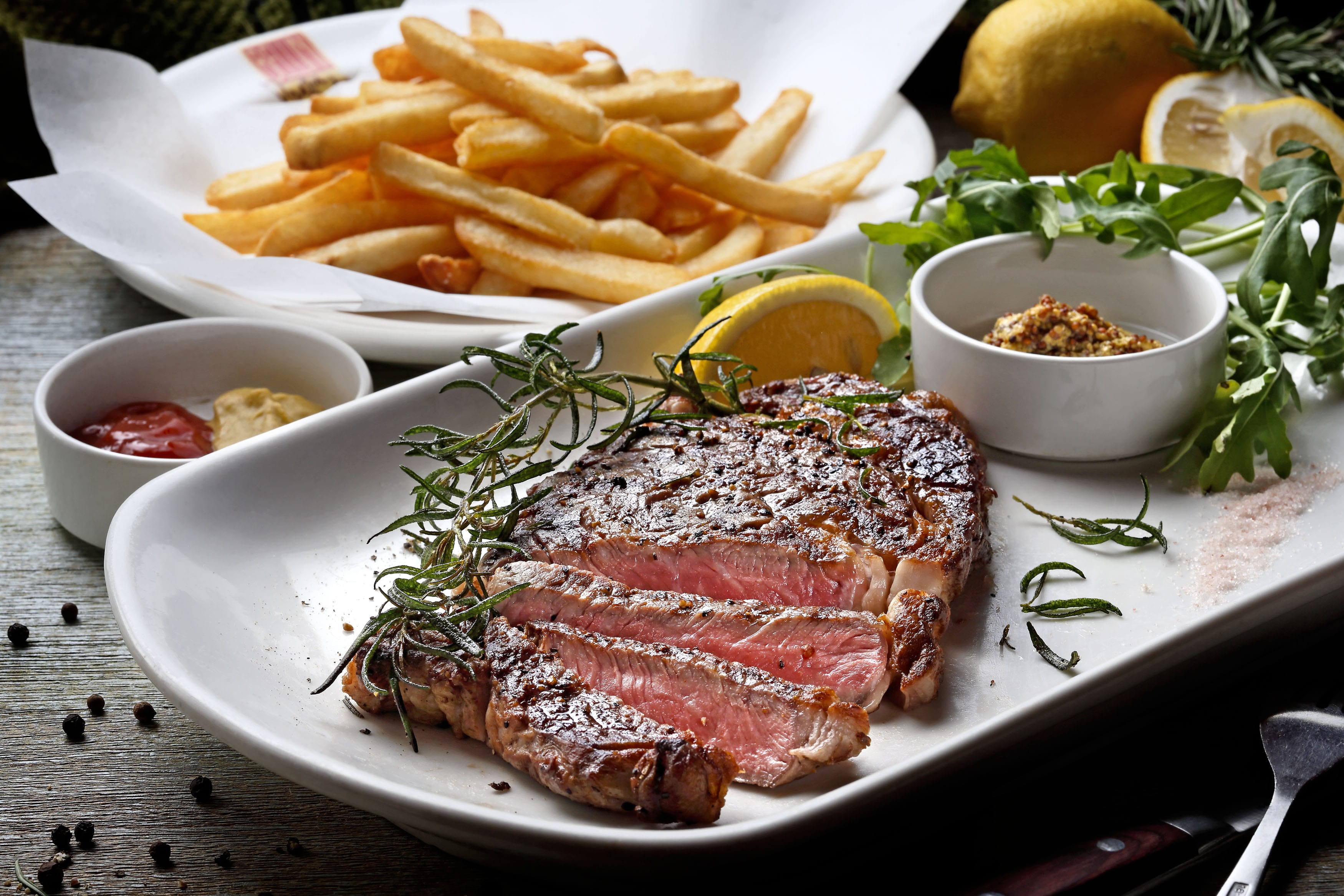 料理方式採用鑄鐵鍋以400度以上高溫大火煎烤,讓牛肉表面具烙印痕跡,增加脆度口感,也鎖住鮮嫩肉汁,建議以5分熟度品嚐,最能嚐到表皮帶有些許脆度,而肉質保有鮮嫩的美味口感。值得一提的是,主廚更特別將炸得酥脆的油炸迷迭香做為搭配,不僅帶來象徵春季的鮮綠色澤,也增添來自義大利風情的香氣。品嚐時,建議先以最簡單的海鹽嚐美國頂級Prime冷藏肋眼牛排的原味鮮美,接著再與檸檬,亦或是有籽第戎芥末醬豐富其味蕾。此外,一旁還有提供現炸薯條供饕客達到超級滿足的完美饗宴。