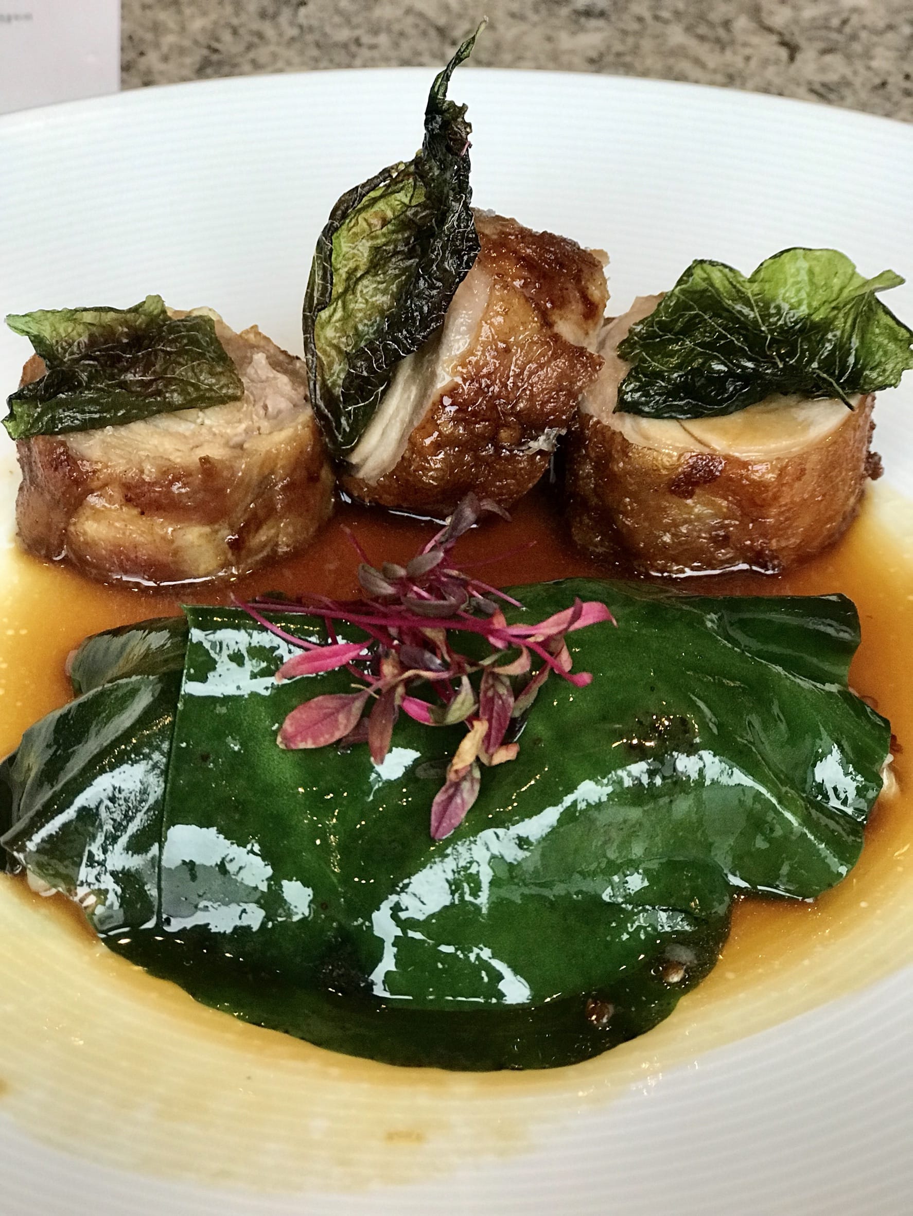 主餐的食材則採用宜蘭嚴選的櫻桃鴨,具有豐富的油脂與不腥羶的鴨肉,再以蒜香白酒炒台灣芥蘭,打成綿密口感的蔬菜泥搭配山藥的滑嫩與白木耳的酸脆,再以甜菜根汁與鴨油調製而成的油醋搭配,提出食材本身的鮮甜與香氣,成功地將在地食材轉化為令人食指大動的美食饗宴。