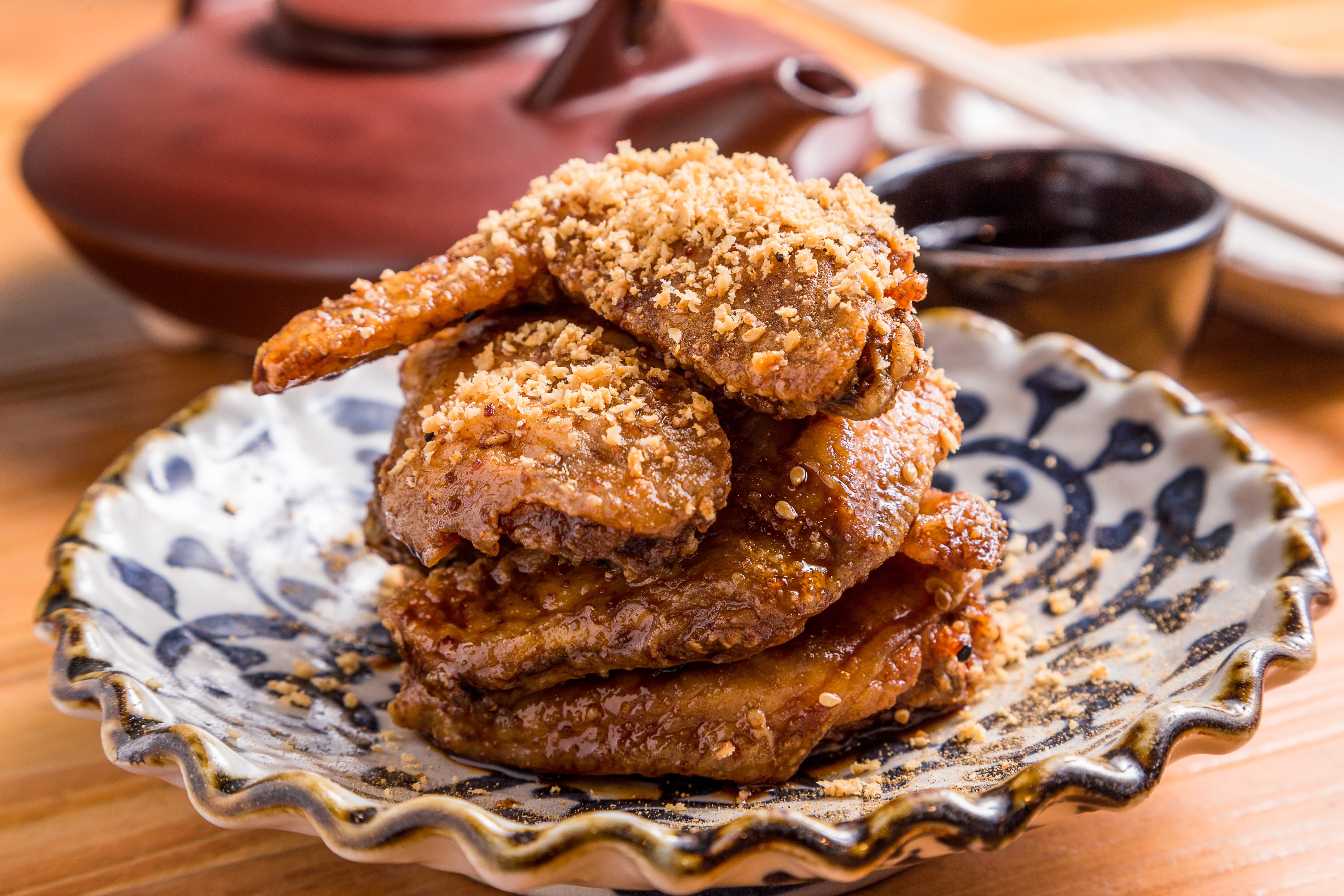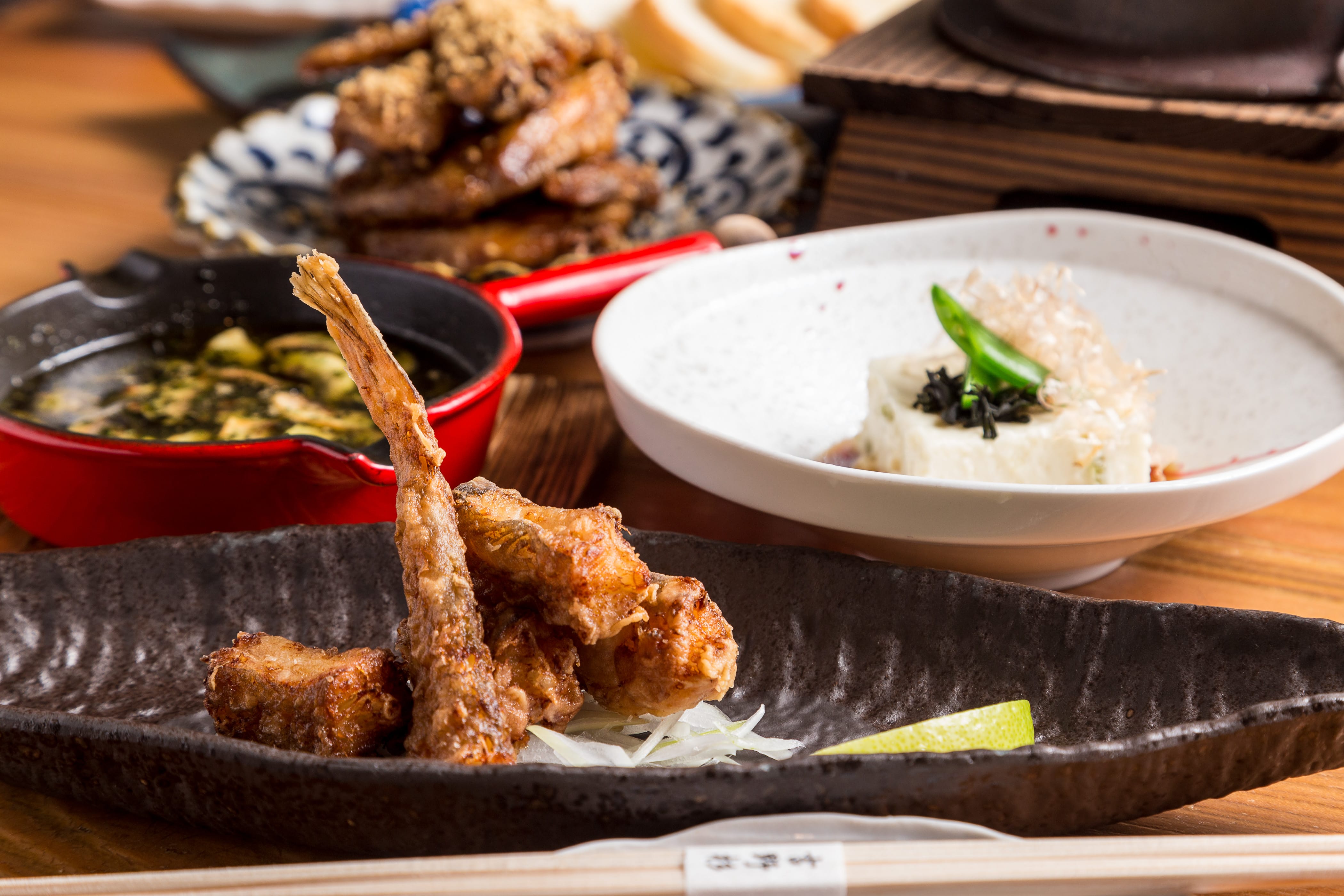 最推薦密傳手羽先唐揚,由二十多種香料調製而成之漬醬,雞翅外酥內嫩伴隨白芝麻的香氣相當誘人。釜飯也是店內招牌,以傳統日式炊飯法,由生米加高湯現炊,米則是使用台南上水香米,每粒米飯都吸飽湯汁,與各式食材如味增牛筋、雞肉、櫻花蝦、中卷等相融合,稠中帶Q、風味十足,而鍋底的鍋巴更香脆好吃。此外,從澎湖直送的新鮮野生魚亦令人期待,歐主廚將其料理成刺身、壽司、燒魚及自家製的一夜干,肉質鮮美甘甜,值得細細品嘗。
