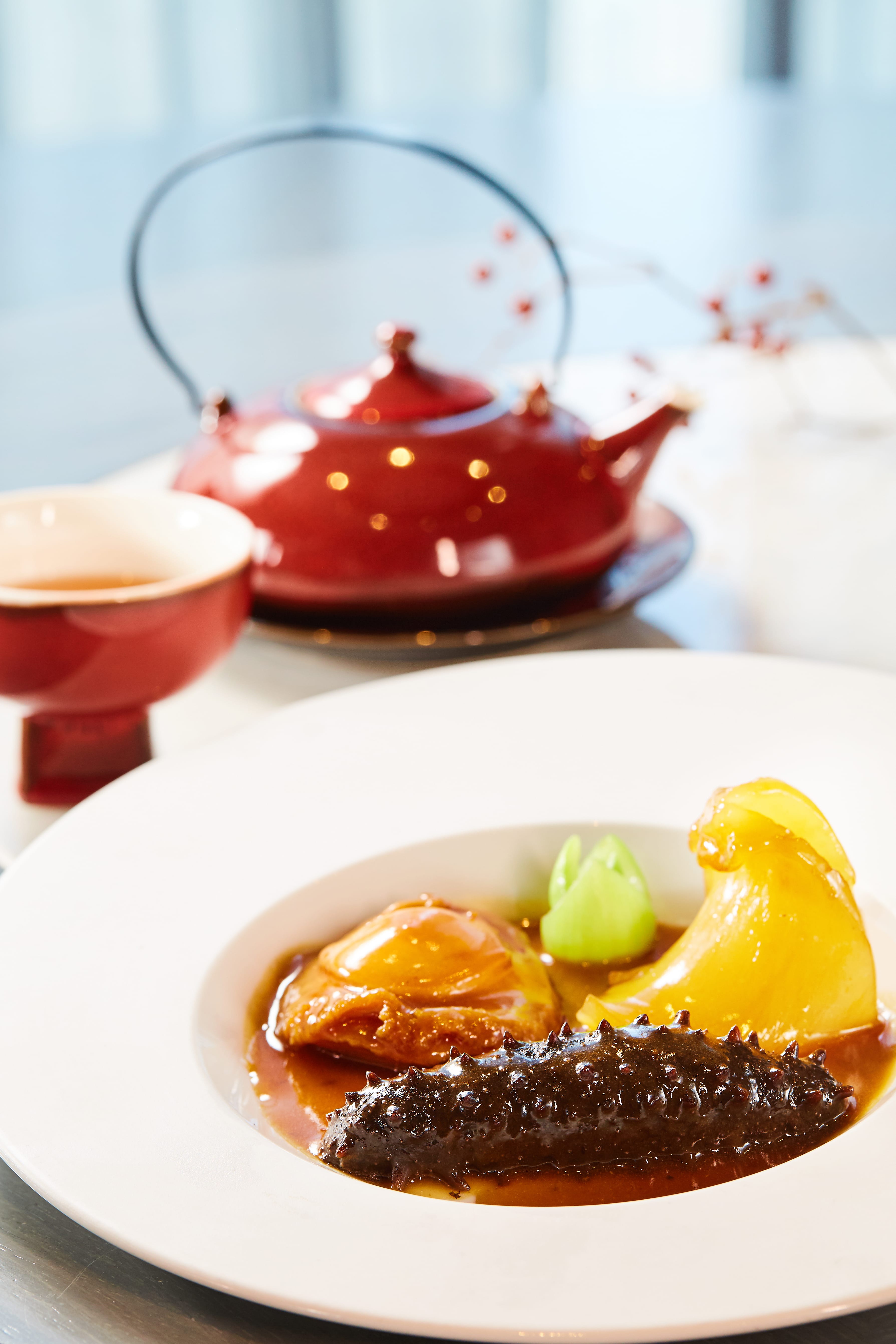 來自北海道的遼參,外型肥厚、刺密而挺,細心煨製30分鐘左右,入口後滑脆又有咬勁,將高檔食材的絕妙提升至臻美境界。選用澳洲三頭鮑加入濃白肉湯烹製的鮑魚汁,更是賦味的重要關鍵。以濃汁加蠔油調味勾芡,淋在煨製過的花膠與遼參之上燴煮一番,多道繁複工法令人敬佩主廚手藝,同時也以銷魂的極上海味,擄獲饕客味蕾。