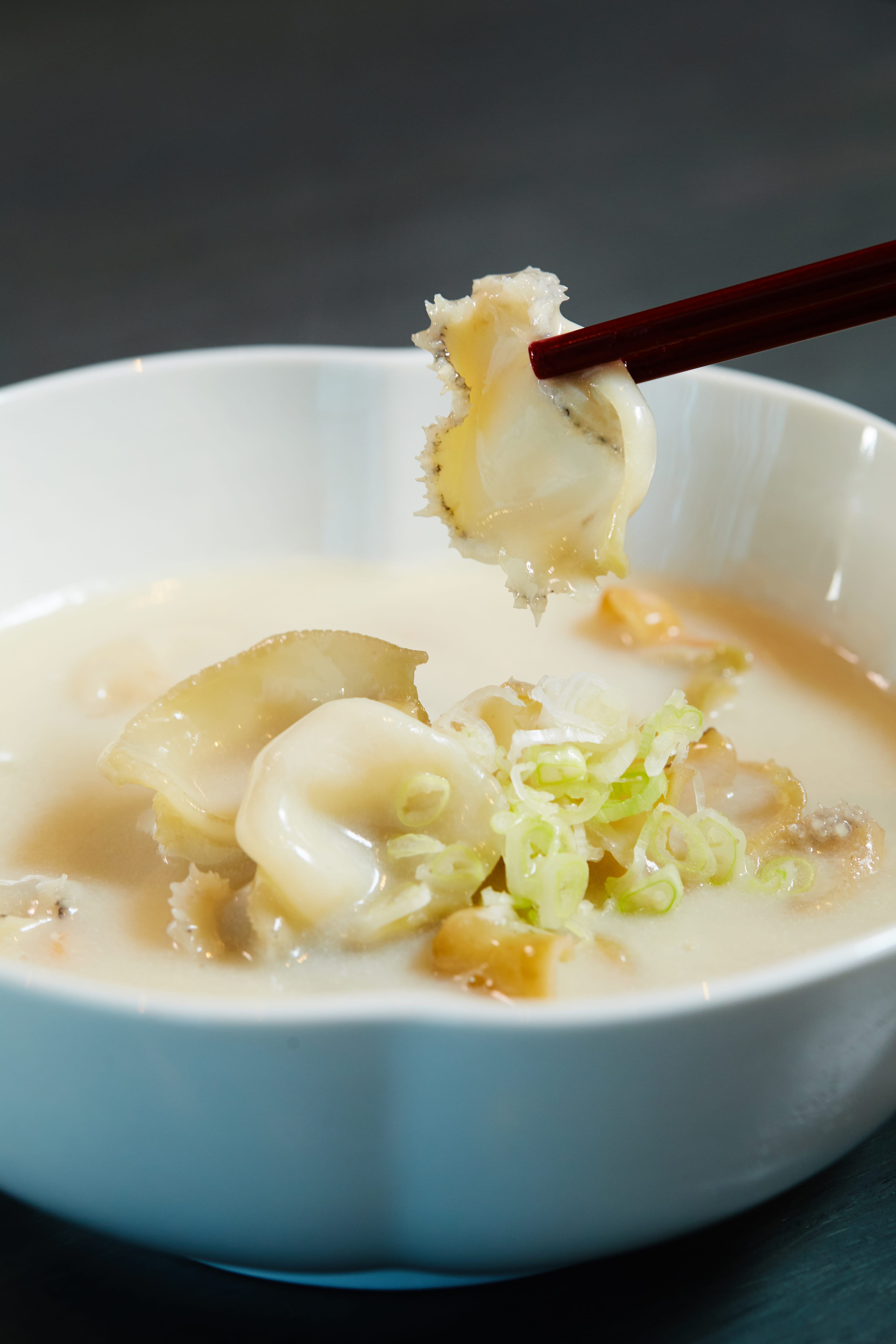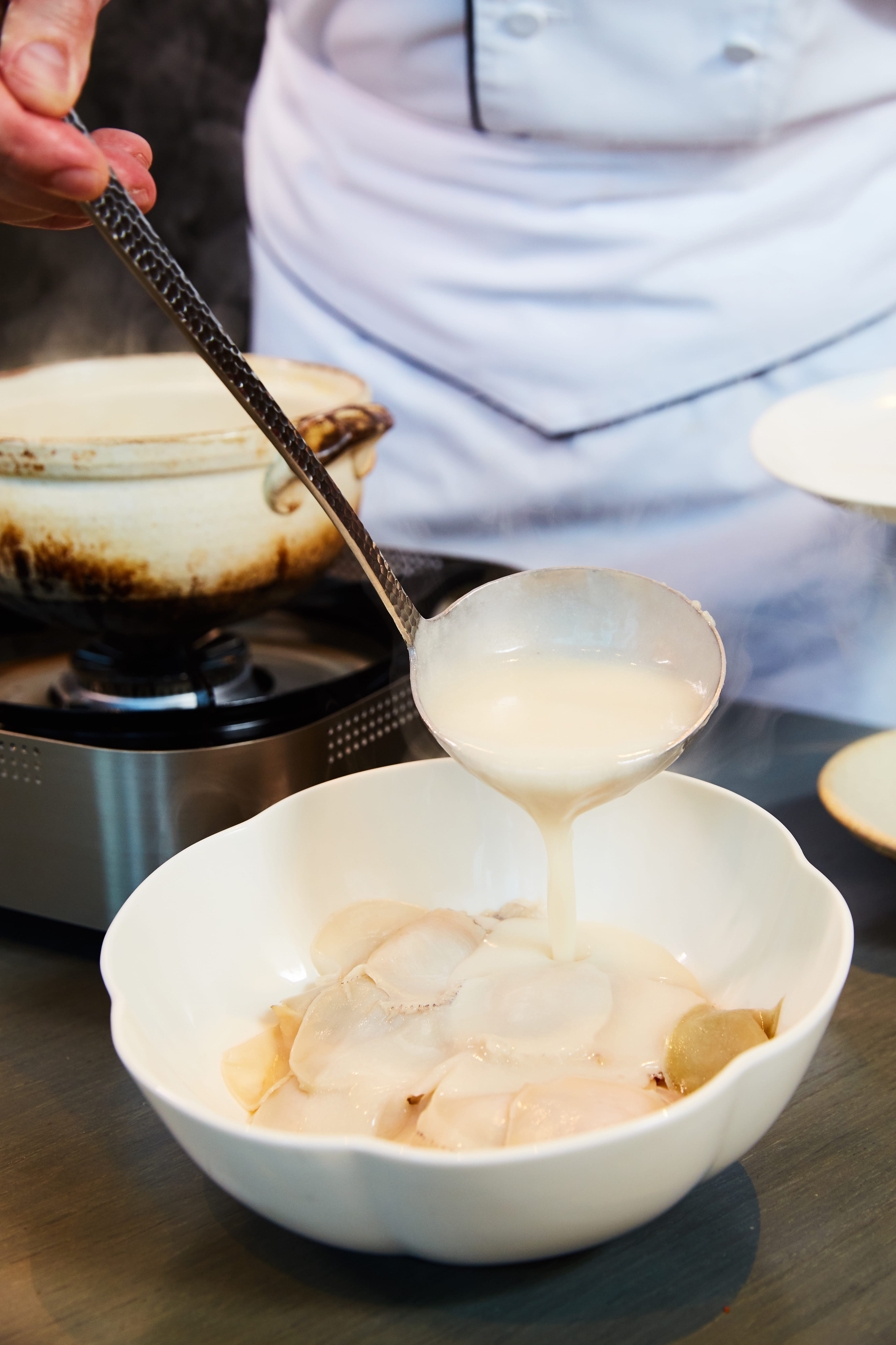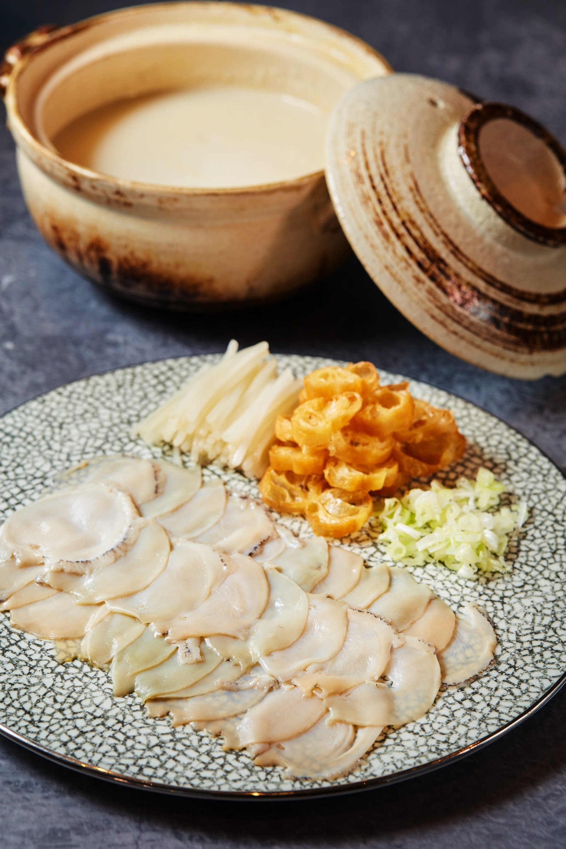 蘇主廚以博大精深的粵菜底蘊為基礎,變化出更多創意的功夫手藝菜。粥水過橋鮮鮑片,以過橋烹技結合粥水概念,將老菜重新創作。「粥水」以白粥為底將米粒化於無形之中,加入適度的油與鹽,在滾燙之時澆淋在食材上,將鮑魚、銀芽、油條泡熟至恰到好處,入口後皆是新鮮甜美。
