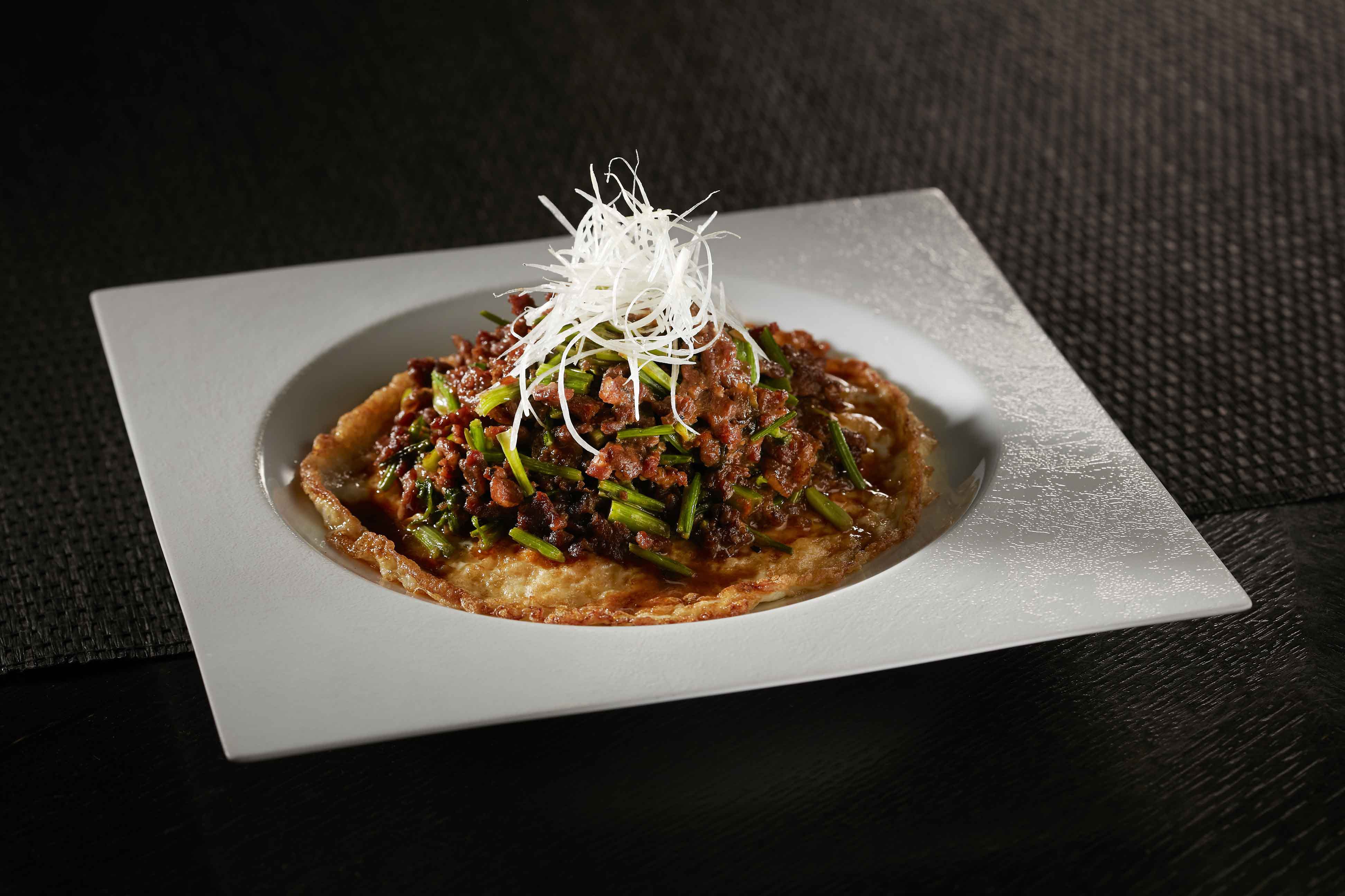 『香根牛肉鬆燒蛋』靈感來自於川菜的燒蛋料理,主廚將四顆新鮮雞蛋以大火香煎兩面,並細膩調整火侯維持蛋黃半熟之狀態,將爆炒後完美吸收鹹香醬汁的牛肉絲以及香菜根鋪於其上,迷人的草本氣息巧妙襯托出牛肉爆漿燒蛋的濃醇,令人齒頰留香。