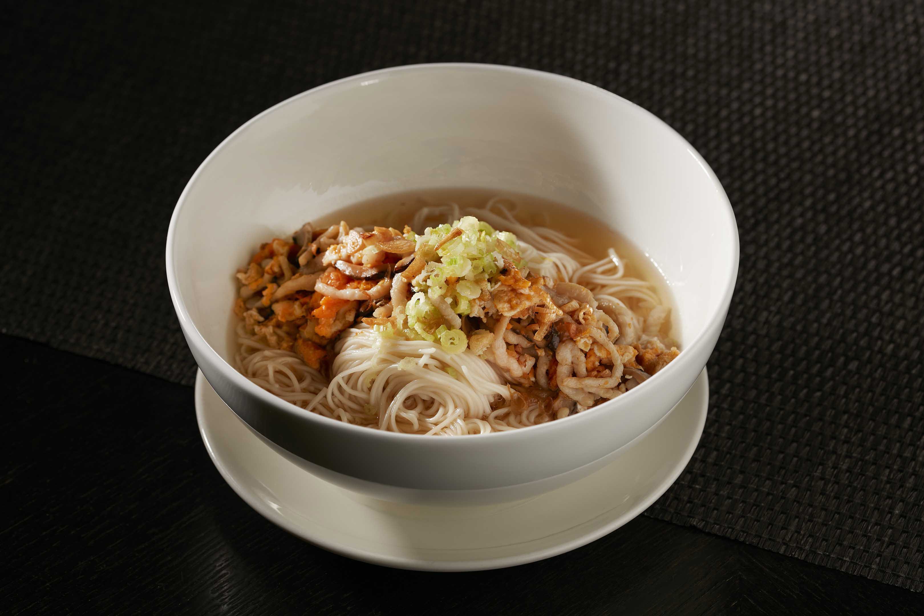 『紹興酒蛋米線』源於道地福州料理,溫潤滋補的美味是主廚家傳的私房菜譜。主廚重現濃濃的古早味風情,秘訣在於以紹興酒、藥膳與鹽巴一同醃製45天的入味雞蛋;作法是由肉絲、香菇絲、蝦米及紅蔥頭爆香後,再加入陳年紹興與高湯,以溫火烹煮,起鍋前打下酒蛋化為蛋花。暖心甘醇的湯頭散發著紹興的馥郁醺香,搭配著麵線與輕薄如絲的酒蛋花一同入口,柔潤芬芳訴說著傳統的溫暖滋味。