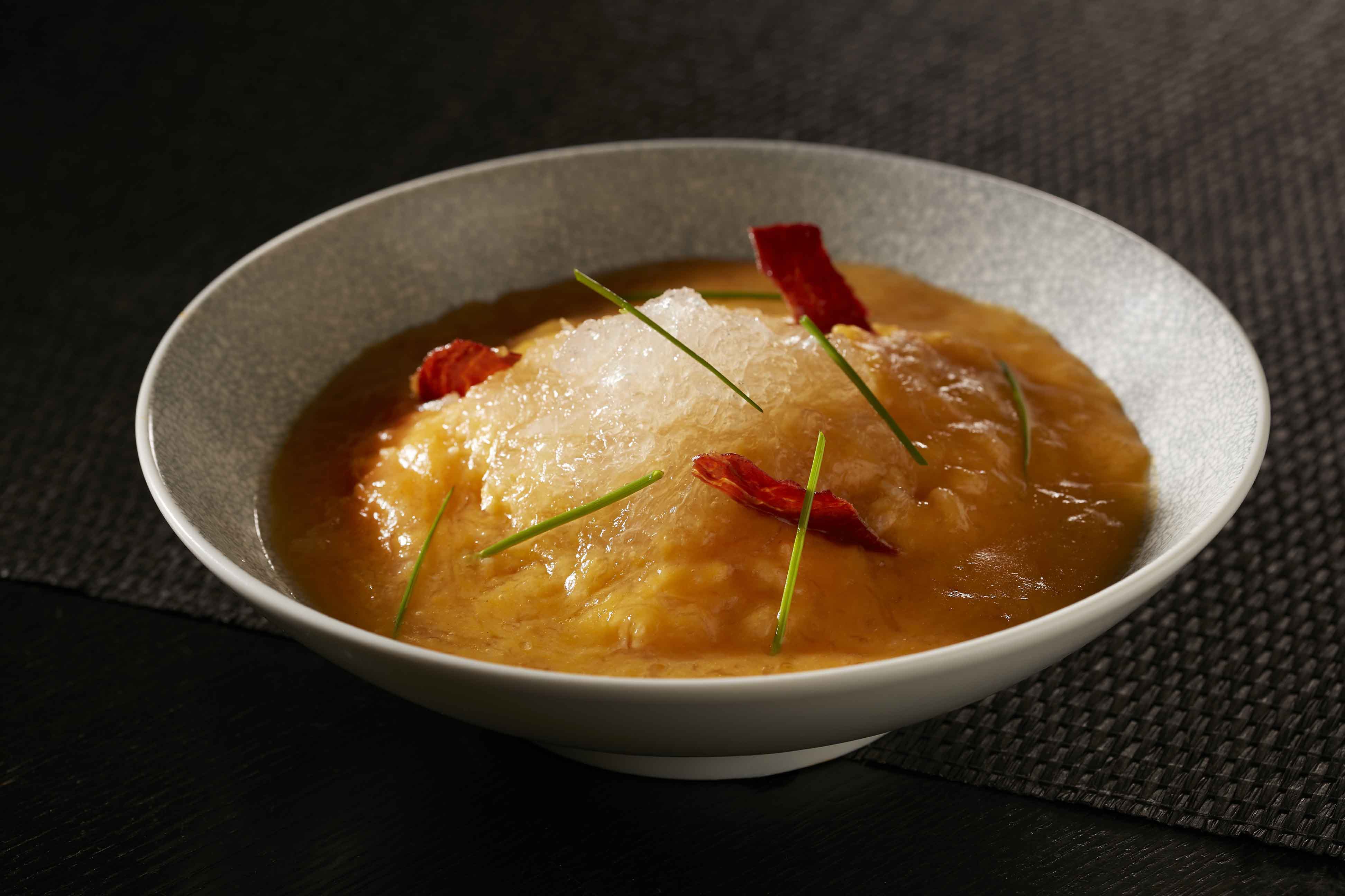 『雞粥官燕撈飯』如虹彩層層,精緻口味各有巧思:最底層為選用泰國香米的金黃炒飯,加上烘烤後香氣四溢的伊比利豬火腿片,再覆上以紅蘿蔔泥增添顏色變化,同時賦予清爽蔬果香氣的雞粥,豐富了味蕾。最後,主廚綴以印尼5A一級的官燕,口感鮮嫩軟滑,外形好似雪白雲朵,由下「撈」起的精彩美味,為賓客締造奢華享受。