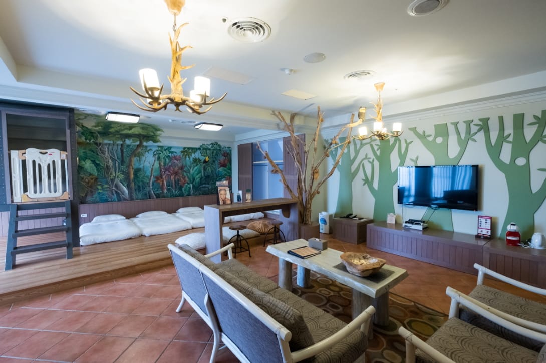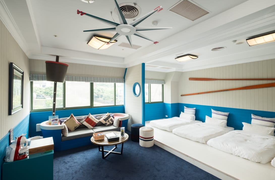 天籟有多款房型,包括草山客房、映月客房、和風客房及親子最愛的童話森林、海上船屋主題客房,手繪的森林壁畫鮮明生動,而鏡子就是一個舵,好像把陽明山跟金山的海搬進來一般。