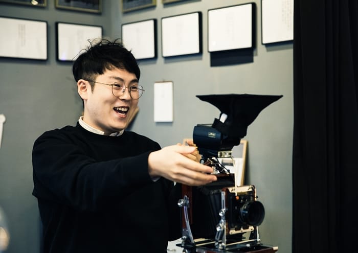選擇國際市場作為照相館的起點,李忠燁認為這裡融合了釜山的過去與現在,而黑白照片是男女老少都能在國際市場留下回憶的方式。成像漸漸在停產的富士FP-3000B底片上浮現,復古相機獨有的顆粒感、細緻分明的黑白輪廓,交織出一幅令人感動的畫面。