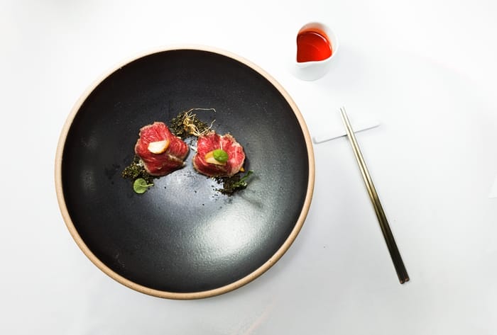 炙燒牛肉覆蓋著新鮮魷魚、白菜絲、梨子,上層點綴著大蒜增添整體濃郁香氣,四周灑上炸過的紫菜,一口吃下,同時感受到多汁鮮甜及柔嫩的肉質。
