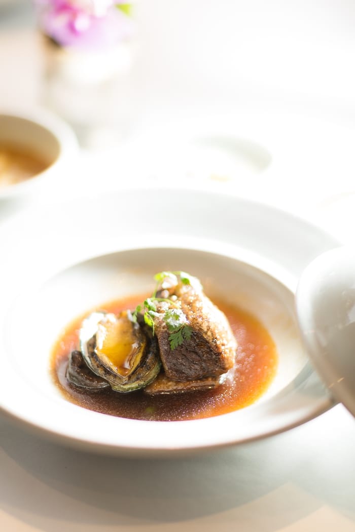 午間套餐的主食有牛排佐鮑魚,以及清蒸鱸魚義大利麵可供選擇,兩者皆顛覆傳統韓菜的厚實口味,用淡雅手法重新翻轉,每一口都吃的到食材原味,與熬煮後的鮮美醬汁風貌。