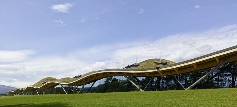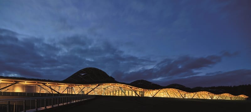 基於此理念,Graham Stirk想出獨特的圓頂設計,如波浪般的木造屋頂結構由380,000個獨立構件組成,是世界上最複雜的木造屋頂結構之一,新酒廠倚著麥卡倫的精神莊園Easter Elchies House以及酒廠的命脈斯佩河而建,天衣無縫的嵌入當地景觀,遠遠望去就與斯佩賽區常見的天然丘陵毫無分別。夜晚亮燈後像是嵌進背後的星空一般,更是美的無與倫比。