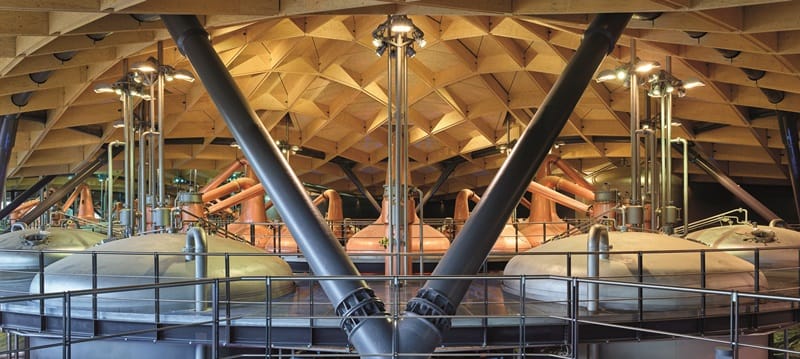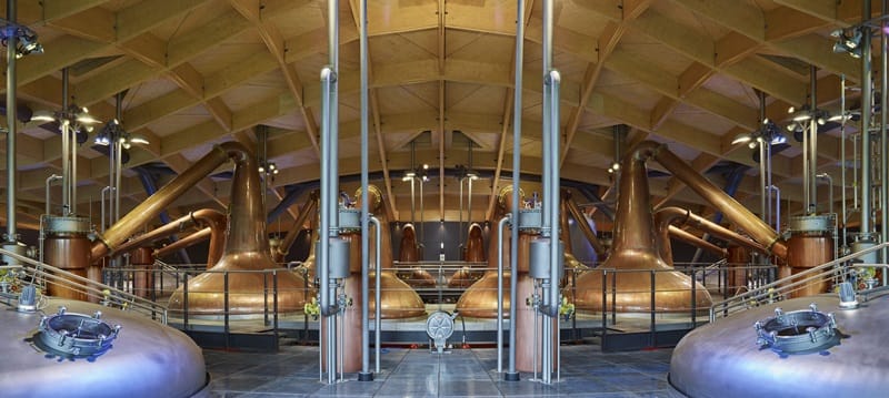 36支蒸餾器分為三組,圍繞著三個圓型均勻分布在蒸餾間內,充分展現精密對稱的協調性,一眼望去那種宏大壯闊呈現出來的氣勢令人不自禁的為之讚嘆;由上方俯視,各種管線井然有序的分布於其下,就像是手工裝嵌的瑞士鐘表面盤一般,滿溢著令人目眩神迷的工藝之美。「我們都說希望打造出史上最美麗、最協調的酒廠,你可以實際看見各種元件,希望它以最美麗的方式呈現眼前。」麥卡倫這樣宣示著。