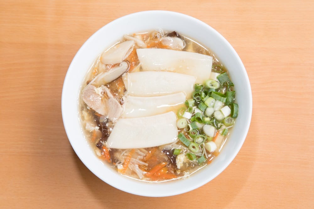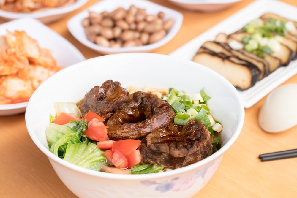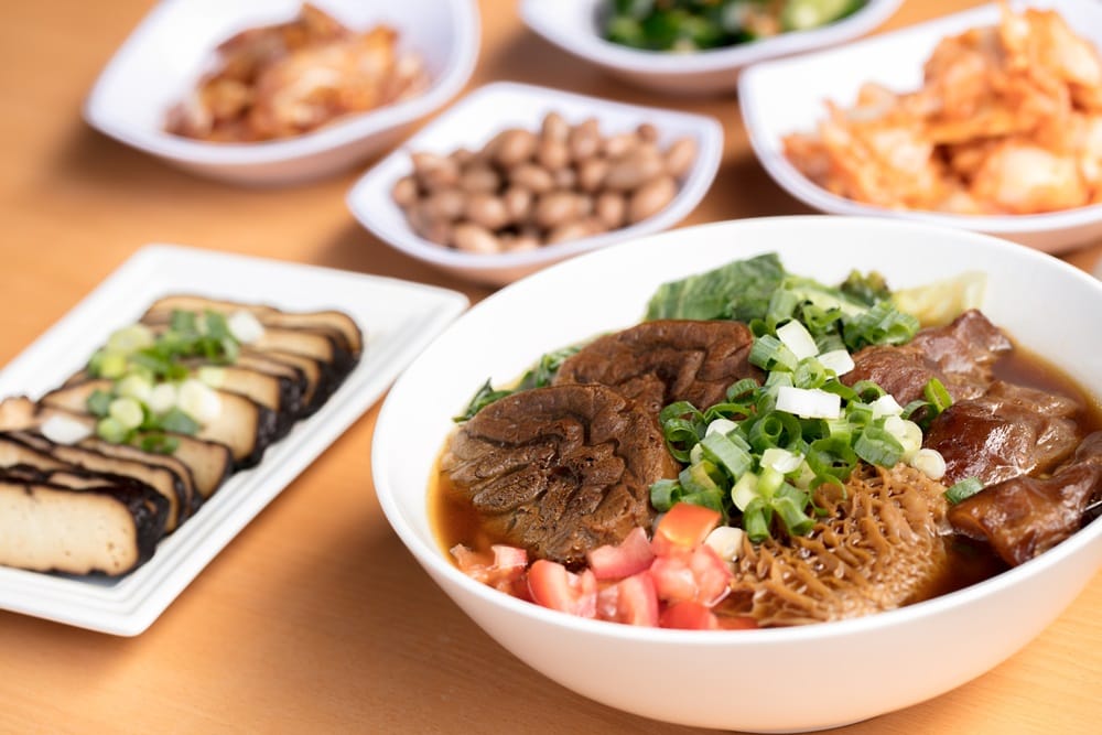 吸飽湯頭精華的細拉麵上擺放紮實滷得透味的牛肚、牛腱和牛筋,每塊厚度都超過1公分以上,肉質彈性有嚼勁,招牌牛三寶麵吃起來超過癮、太銷魂;其它還有筋肉麵、牛筋麵、蔥燒牛肉麵、牛肉乾拌麵等,也是人氣美食。如果不吃牛肉,另一個推薦,就是鮑片大滷麵、鮑片酸辣麵、鮑片酸辣湯可供選擇,同樣料多味美,湯汁勾芡恰到好處,不會太濃稠,這一碗吃起來也是份量十足,讓人稀哩呼嚕的一口接一口、欲罷不能。