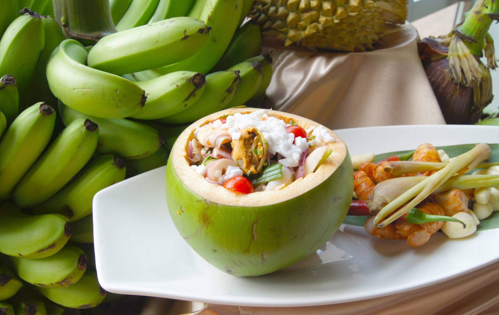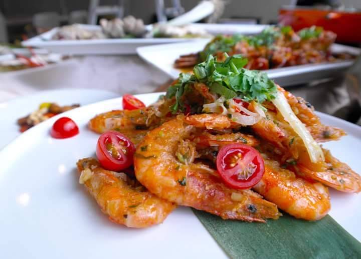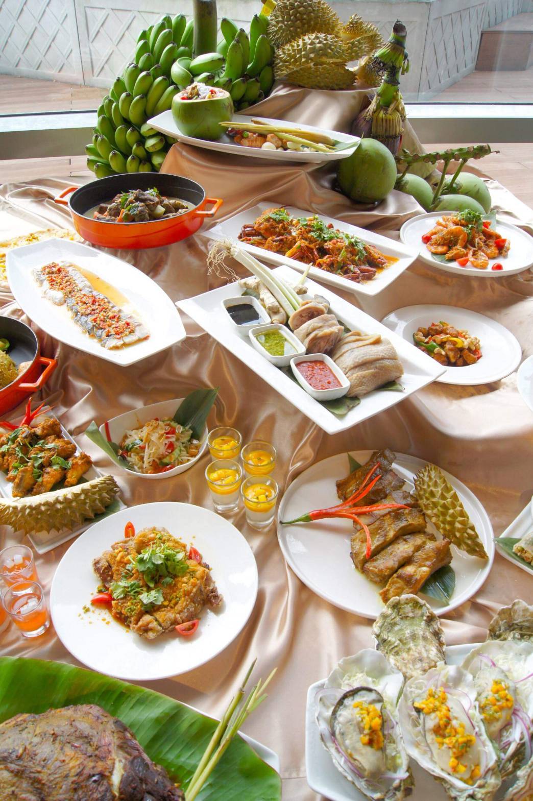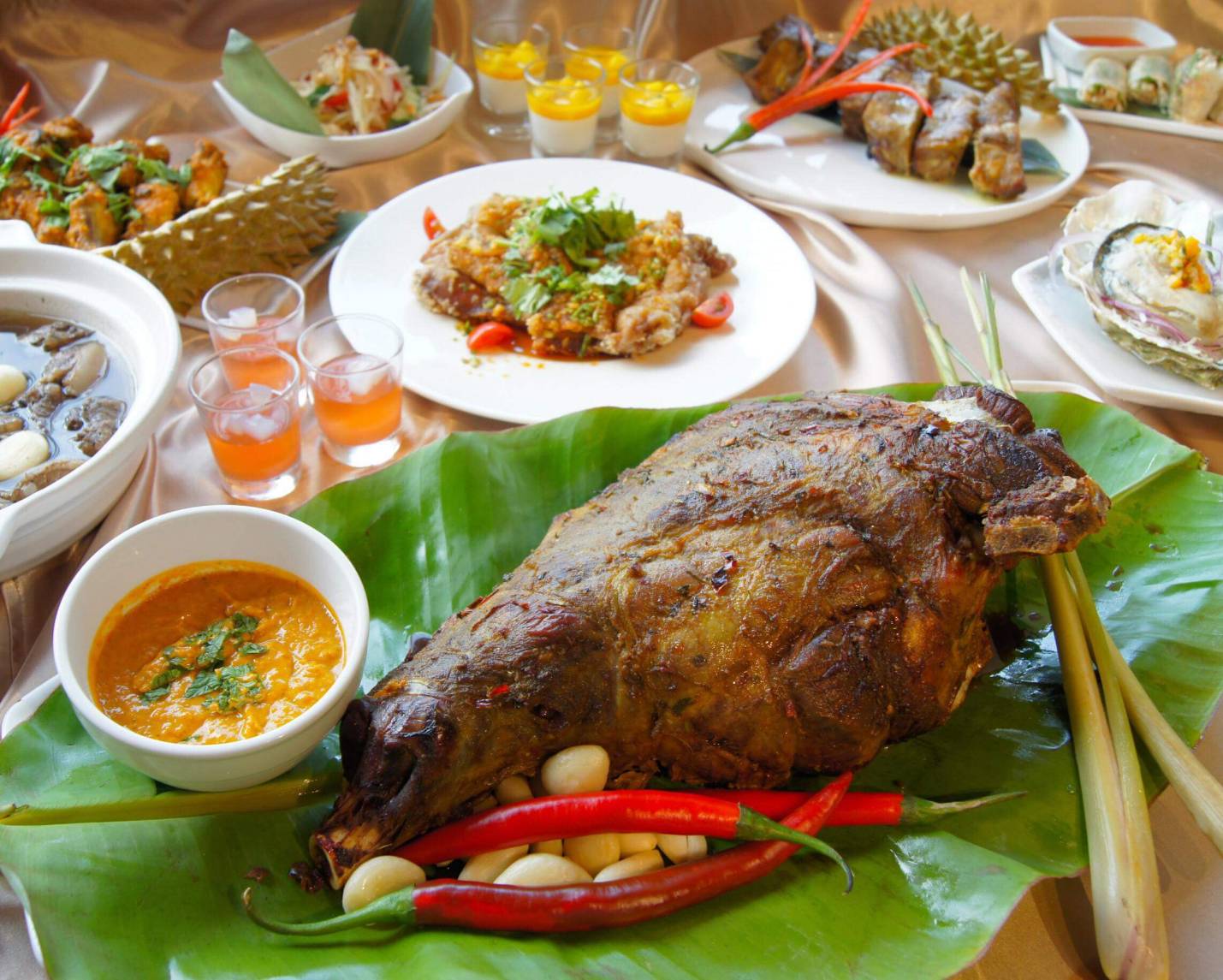 即日起至8月底,秀廚自助餐隆重推出南洋美食節-泰瘋Food,從傳統的泰式涼拌木瓜絲、打拋豬、冬蔭功湯(泰式酸辣海鮮湯),到馬來西亞烤羊腿、香蕉葉裹烤魚,高得明主廚使出了拿手絕活,不枉這些年陸續在曼谷、首爾等地參加國際美食比賽都拿下了非常優異的成績。而在湯類的較勁上,泰式酸辣海鮮湯對上新加坡的叻沙麵及肉骨茶,都讓饕客舉起大拇指說讚。而最不能錯過的是來自印尼的沙嗲燒烤、年輕人最愛的酥軟滑脆的炸魚餅、平常吃不到的創意榴槤Pizza等,通通都在這次的美食菜單中。