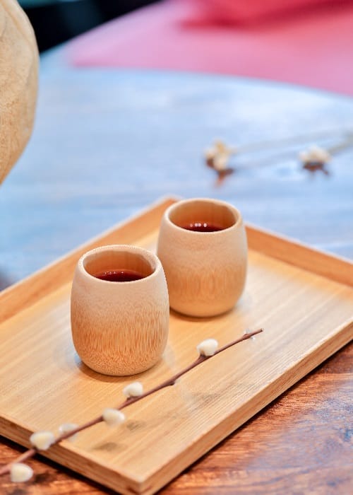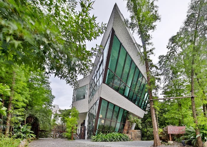 這裡幾乎終年霧霧飄渺,所以取名為「出霧」,以木材、石頭等自然元素作為建築基調,斜面玻璃面的外觀深具特色巧思。這屋外63度角是有設計典故的,起霧積雲於天際時,陽光經由雲層撒下的道道光芒,剛好和「出霧」63度角屋簷相互呼應著。在小而美的接待大廳,迎來63度的台式鞠躬招呼,夏天奉上自製冰涼酸梅湯,冬天端上暖呼呼薑茶,感受溫情適切的服務及款待。