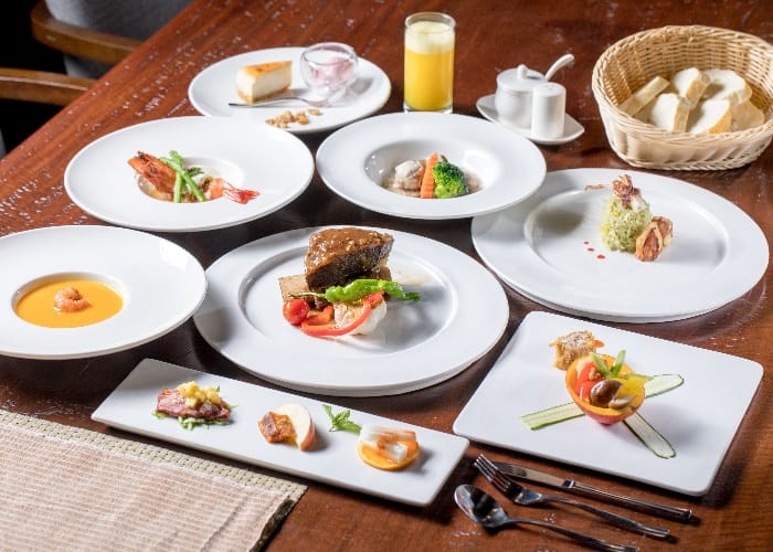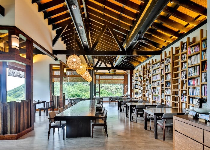 「出霧」客房的美已令人心嚮往之,來到頂樓的出霧書房更捨不得離去,挑高的木質架構,整面書牆,最棒得是大面窗景,此時佐著美景、品嘗美食更感幸福。採用當季在地食材,表現63度最佳烹調溫度。這一季出霧套餐,前菜三品來自東港烏魚子、梅汁日本山藥、櫻桃鴨胸肉,吃得小巧又精緻,鮮甜海鮮南瓜濃湯搭配軟包超對味,香芒鮮帶子有著夏季清爽滋味,展現手路菜的手作百花魚卷好綿密,薑黃小卷燉飯香氣迷人、吃得到海裡鮮味,主菜為台塑牛小排、大草蝦的海陸雙拼誠意十足,最後冰淇淋甜點畫上完美句點。