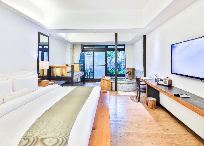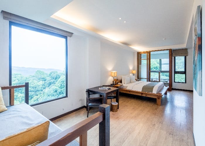 「出霧」量體雖不大,貼心規劃28間雅緻客房,要把空間、採光、浴池的自由伸展度留給客人。因此每間客房約13坪以上,整體採溫潤內斂的木質色調,選用高檔硬木傢俱,散發原木的舒適香氣,並將最好的綠意窗景留給溫泉湯池,秋冬能夠泡55度的溫泉,春夏泡32度冷泉。