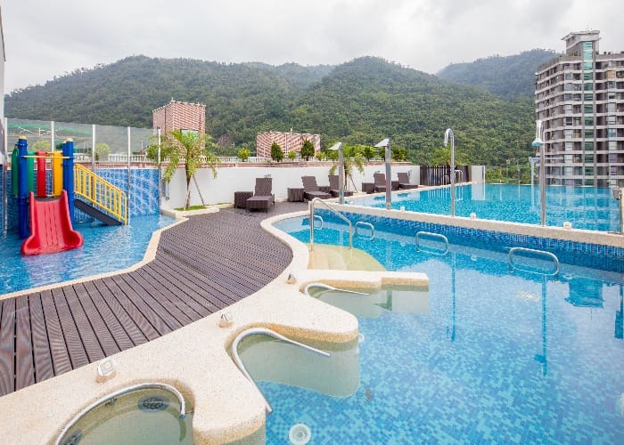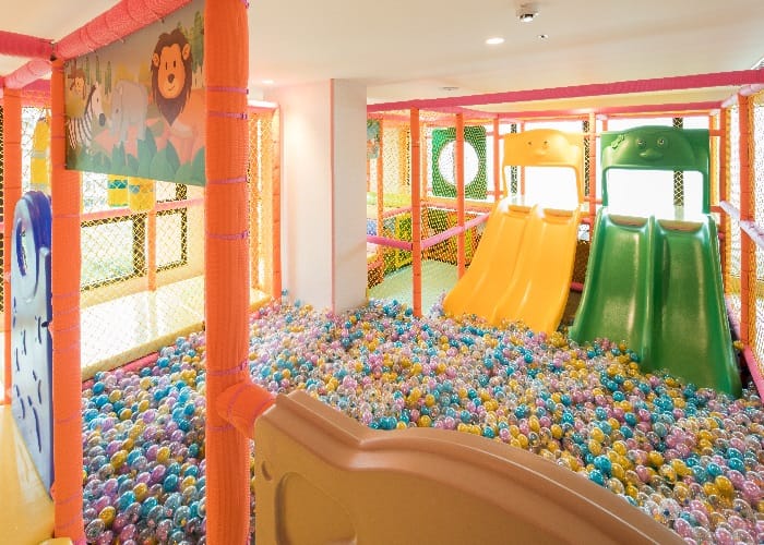 設於高樓層的休閒中心水深120cm的無邊際設計泳池、水療SPA,白天徜徉陽光綠意,夜晚蛙鳴相伴,一旁是專為孩童身高打造的溜滑梯水池,以及蒸氣烤箱。同層樓的室內規劃有Fun樂園兒童遊戲區,包含積木遊游樂球池、積木之湯、Fun玩彩繪牆,足以讓小朋友嗨完大半日。