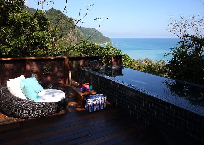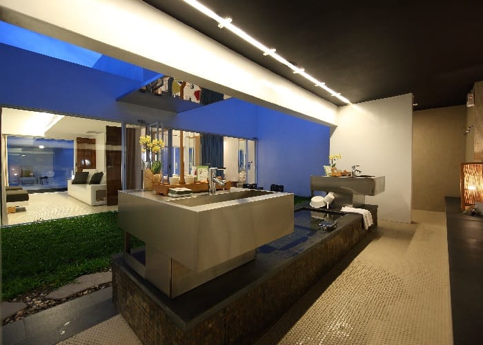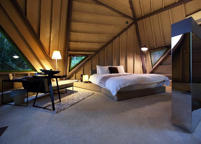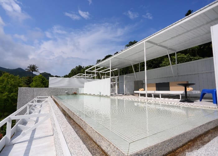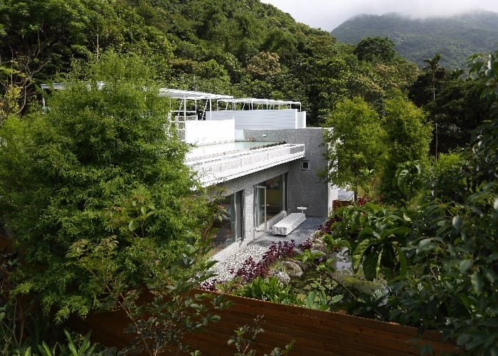 同樣私擁著另一片梯田蓮花池,「空中鏡面屋Villa」為獨立的兩層樓雙併別墅,下崁的房屋設計遠遠望去彷如與樹群融合一體,室內環繞L型的落地窗將室外天光綠意引入,最特別的是,沿著戶外白色螺旋樓梯拾級而上屋頂,印入眼簾的是無邊際的空中水池,視野所及東岸的山光水色,讓人倍感舒暢。