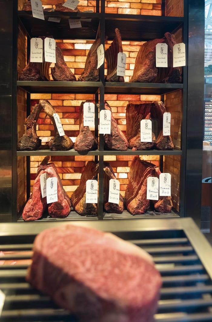 最令人驚嘆的是特殊建造工房內,以大塊喜瑪拉雅海鹽堆砌成整座牆面,將肉品放置於此進行乾式熟成,精準控制溫度、濕度,讓牛肉吸收高礦物質鹽份,藉由乾式熟成的步驟,宛若對肉品施展了神奇魔法,肉質柔軟、風味濃郁。
