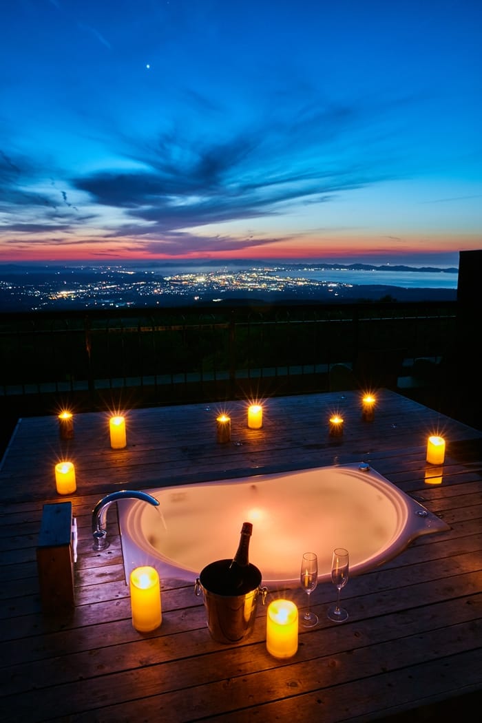 從高台延伸而出的碧綠草坪之外,是彷彿星辰般燁燁生輝的米子市區,日本海灣優雅地平躺在地平線彼端,夕陽西下時,茜色晚霞映照在平靜海面,為寧靜開闊的景色披上一層迷幻的薄紗。「從大山眺望的黃昏晚霞,是我怎樣也看不膩的絕景」Auberge天空的主人長感嘆說到。