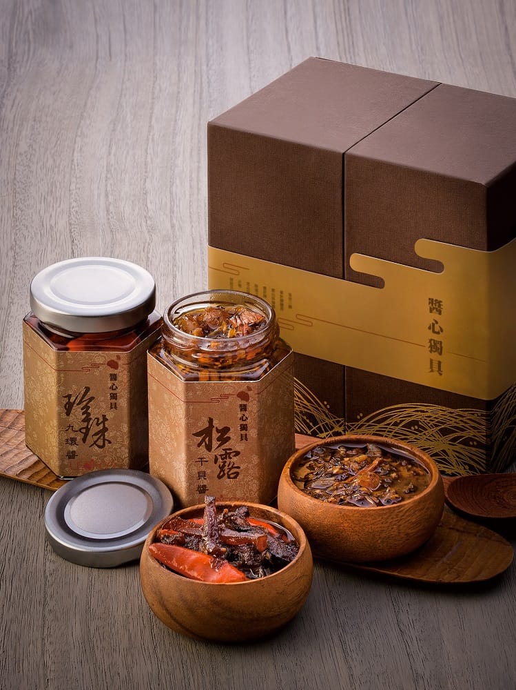 「醬心獨具雙醬組」,添加尊榮珍珠粉,慈禧太后御用的養顏聖品『珍珠九環醬』、與融合中西料理菁華打造,比XO醬更香濃的獨門宮廷秘製『松露干貝醬』。