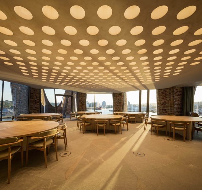 丹麥的金融公司KIRK KAPITAL總部Fjordenhus雖位在經濟樞紐瓦埃勒市(Vejile),卻遠離櫛比鱗次的高樓大廈,選擇建造在海港(The Harbour Island);值得探究的不只如此,建築設計由藝術家Olafur Eliasson擔綱,整棟就是一個大型的藝術品,遠看像四個相連的圓柱體,靈活運用圓形、曲面、拋物線等空間型態,所謂與藝術結合,不再只是劃出一塊藝文空間或擺設展品而已。