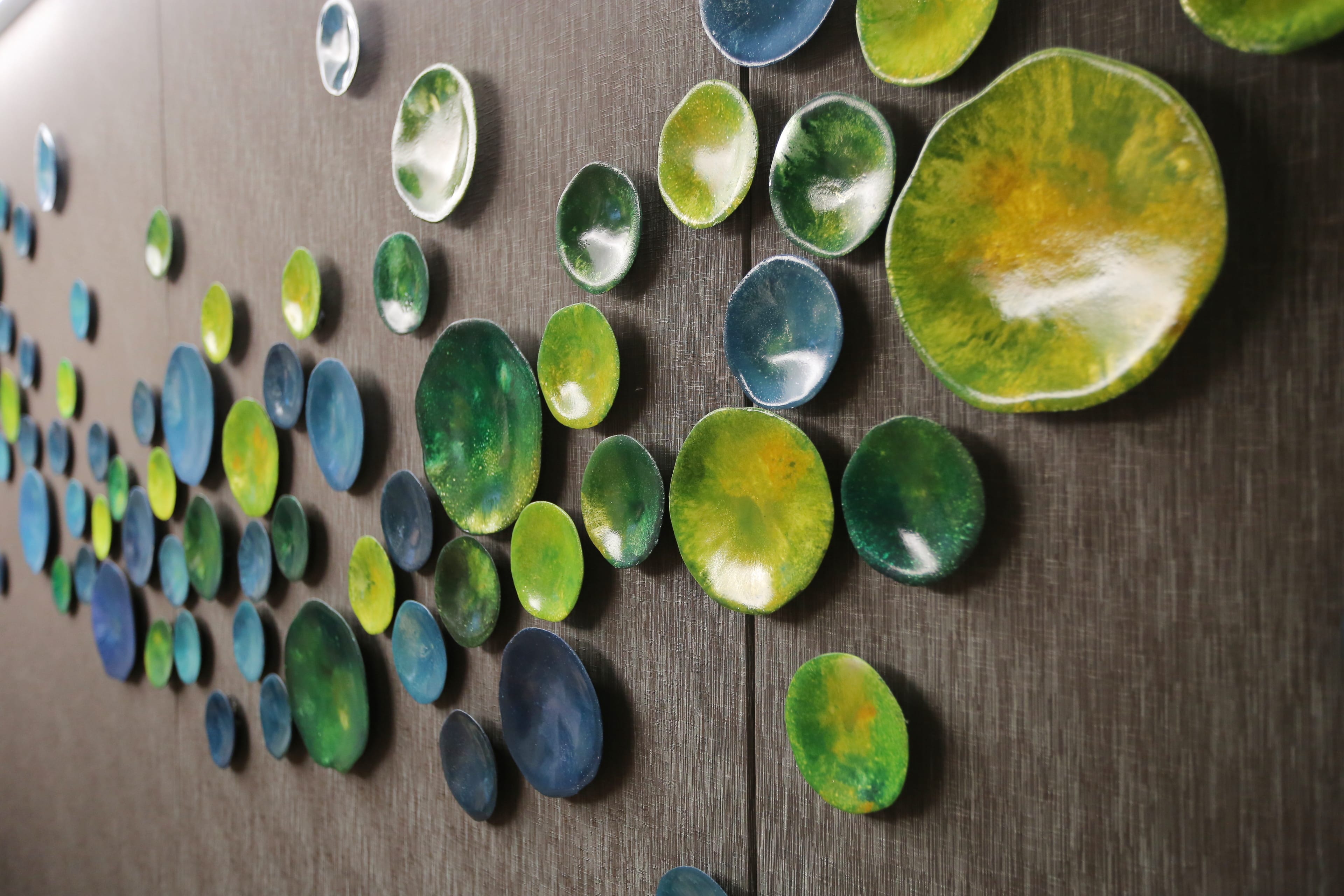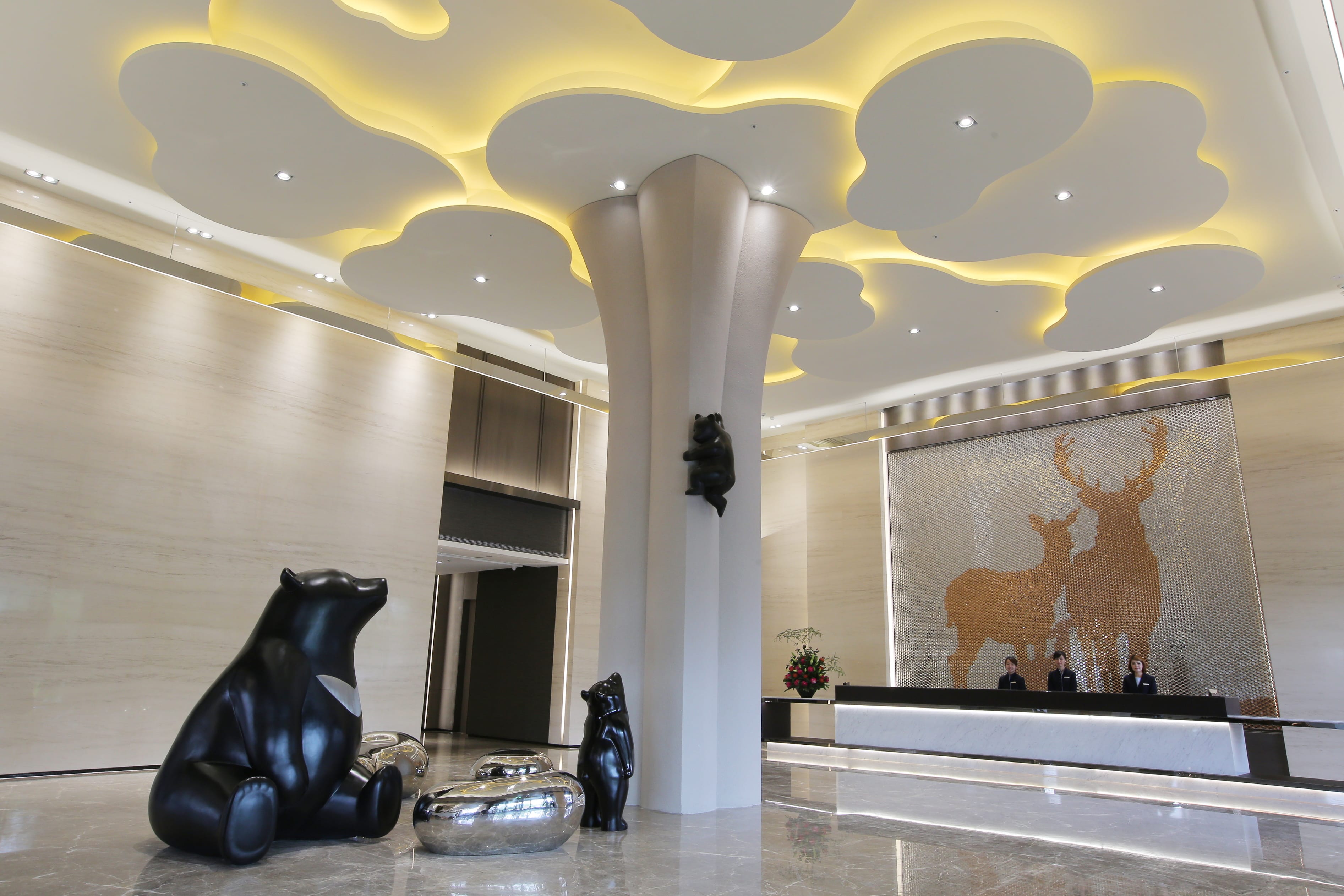 更吸睛得是屋頂上的一頭鮮黃色大熊,儼然已成為嘉義市的新地標。從參與飯店開發策劃的華悅國際管理顧問公司,姚董事總經理表示,講到嘉義就會想到阿里山和檜木,因此「寬悅」設計定位融合自然生態,將專屬於台灣特有的生態印象植入飯店。在外守護的黃色大熊是熊爸爸,大廳內台灣黑熊媽媽和哥哥看著正在爬神木的弟弟,並與櫃檯後面的台灣梅花鹿相望,還有一隻小熊看著窗外。熊媽媽旁的銀色形體象徵希望的神木種子,神木向上伸展至雲海中,這是專屬於「寬悅」的故事,超萌的表情要來療癒大小朋友的心!